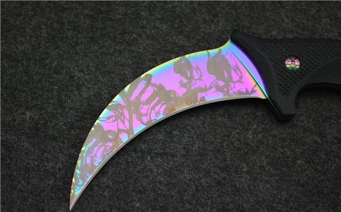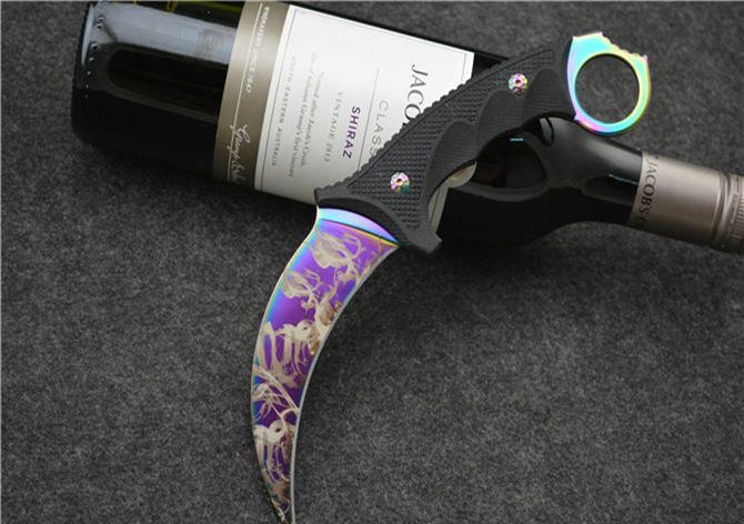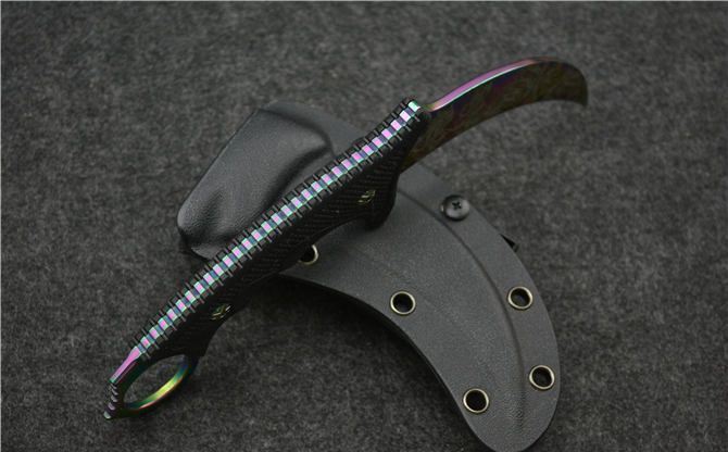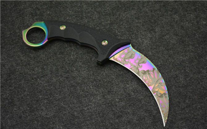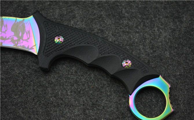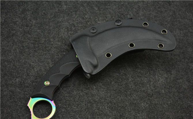 冷钢彩钛钢虎 全长:21.6CM 刃长:10.16CM 刃材:AUS-8 刃厚:4MM 净重:200g 毛重:250g 刀鞘:K鞘 原型:冷钢cold steel 49ks,the one 手工版本,一体龙骨AUS-8 锋刃,坚固强悍,凌厉的镜面刀锋,搭配防滑G10手柄,舒适的手感,完美的爪型,使之成为最凶猛的近身搏击装备。