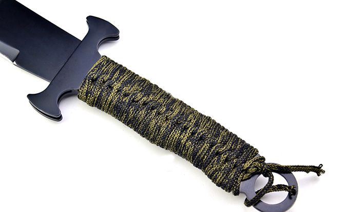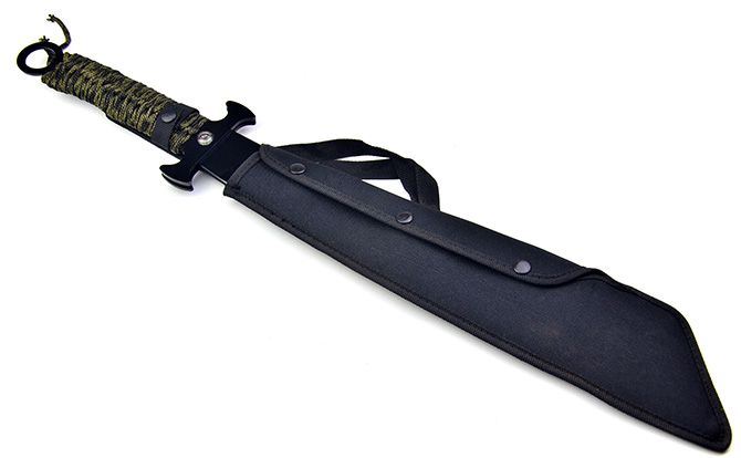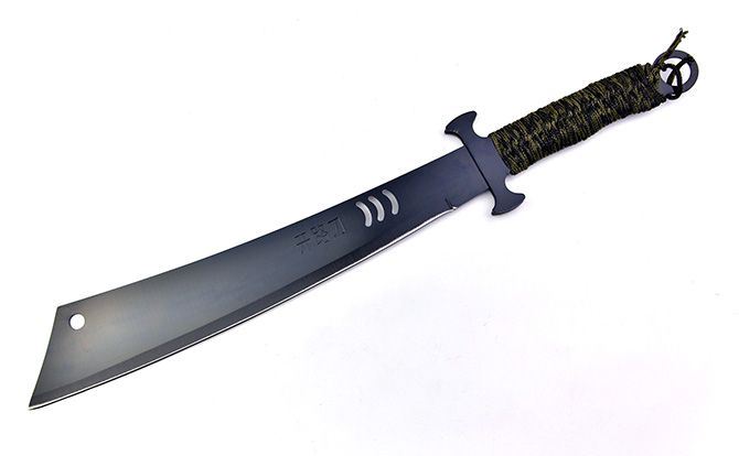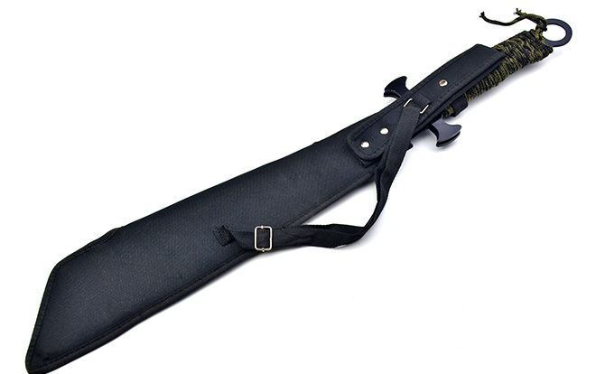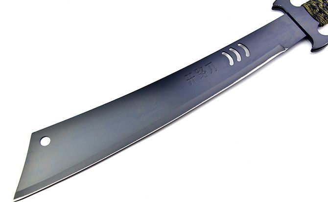 黑版大刀型开路刀(方头) 全长: 58 柄长: 19 刃长: 39 刃厚: 0.35 全不锈钢#420 净重:670克 刀刃硬度: 54HRC以上 刀鞘:尼龙