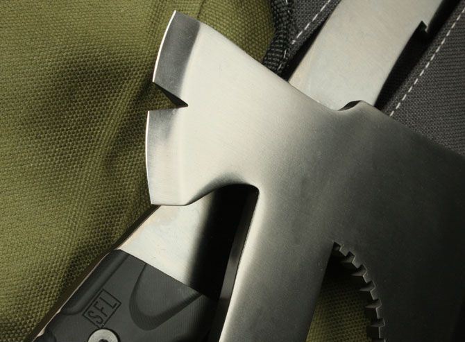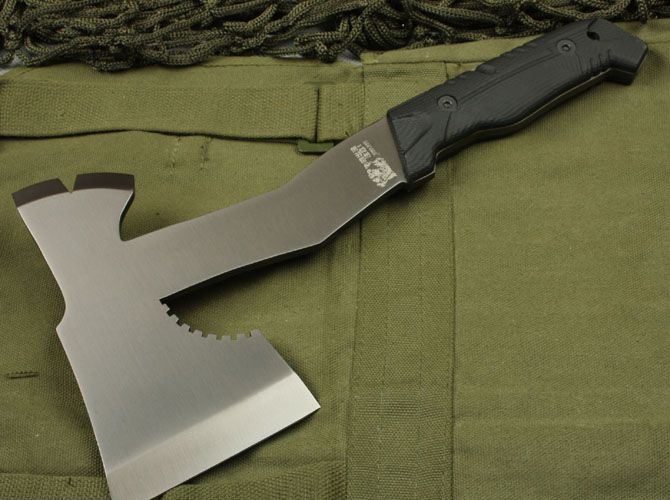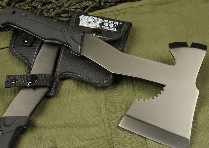熊出没-圣殿神斧 全 长: 31cm 刃 长: 15cm 柄 长: 14cm 刃 材: 5Cr13 硬 度: 56 HRC 表 面: 镀钛金 刃 厚: 0.6cm 净 重: 800g 柄材:进口橡塑(耐高温) 其 他:上下开锋,附尼龙套和彩盒