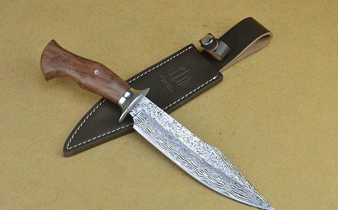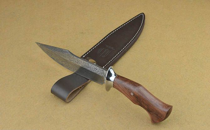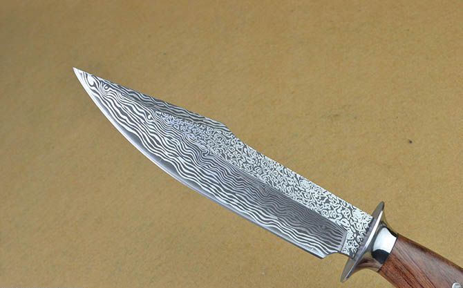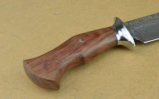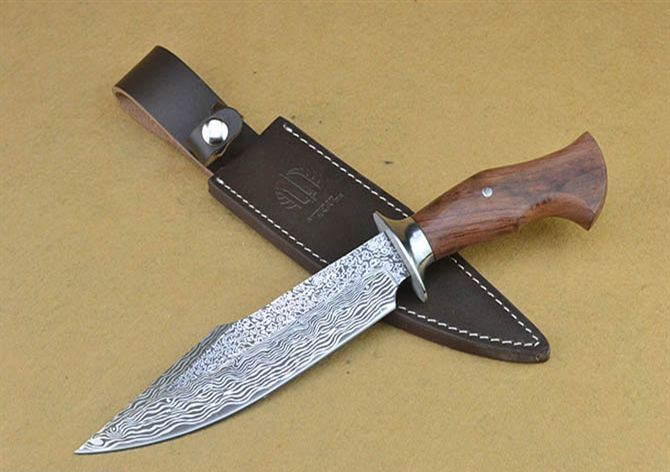 全 长:31cm 刃 长:17.5cm 刃 宽:4.2cm(最宽处) 刃 厚:5.1mm 柄 长:12cm 表 面: 激光仿大马士革 刃 材: 7Cr17 硬 度: 58HRC 柄 材: 钢头+原木 重 量:607克(含包装) 包 装:高档彩盒+皮套