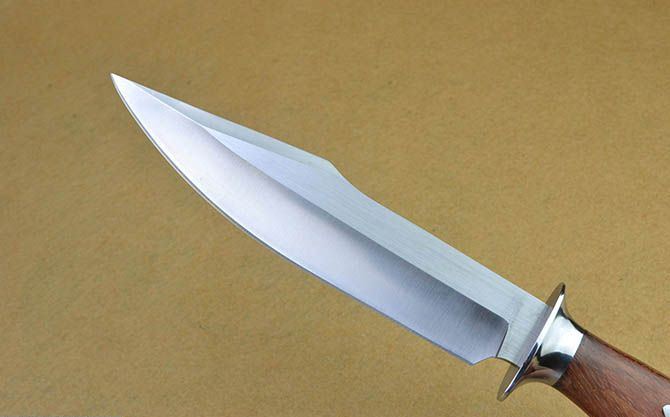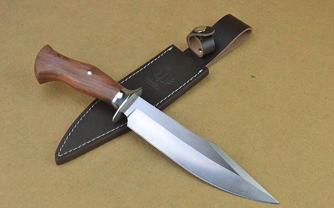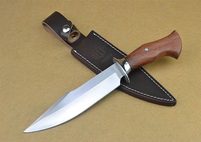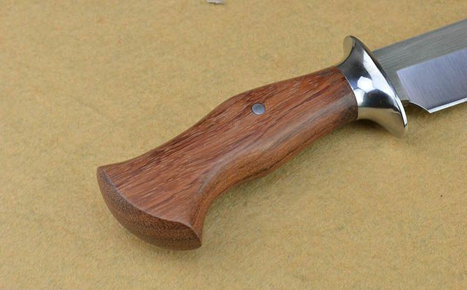 全 长:31cm 刃 长:17.5cm 刃 宽:4.2cm(最宽处) 刃 厚:5.1mm 柄 长:12cm 表 面: 砂光+拉丝 刃 材: 7Cr17 硬 度: 58HRC 柄 材: 钢头+原木 重 量:607克(含包装) 包 装:高档彩盒+皮套