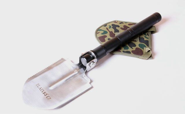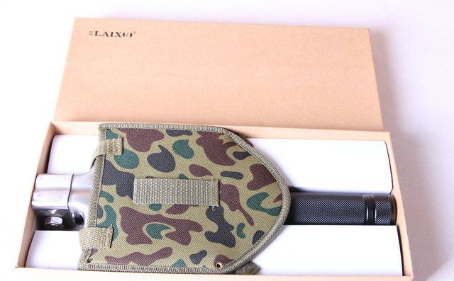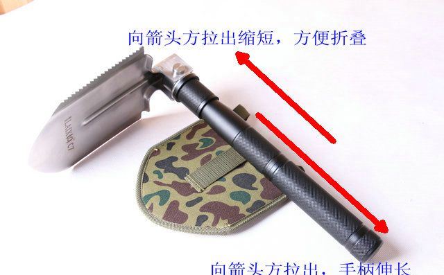 伸展长度:69cm 折叠长度:51.5cm 锹面尺寸:18*13cm 刀刃长度:12.1cm 厚度:3.0mm 重量:约1100g (含包装物) 刃材:进口不锈钢 柄材:加厚航空铝材+发黑色 包装:迷彩牛津布袋子,可挂腰上 特点:手柄拉缩型,方便折叠,当手柄拉尽时,再反时针扳转手柄,螺纹已紧.收回时,顺时针反回,再拉回,完成手柄伸缩程序.