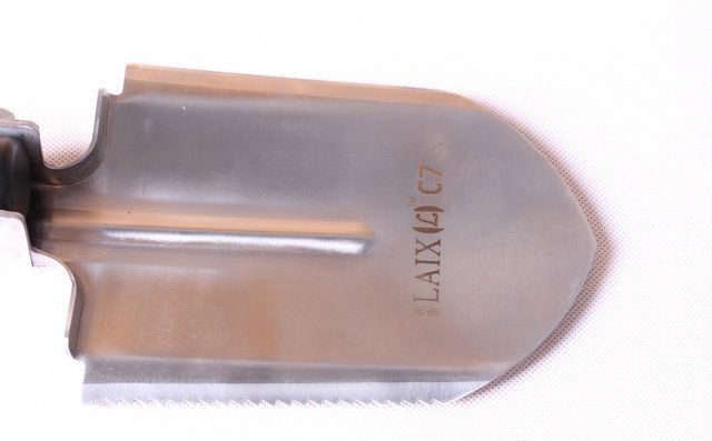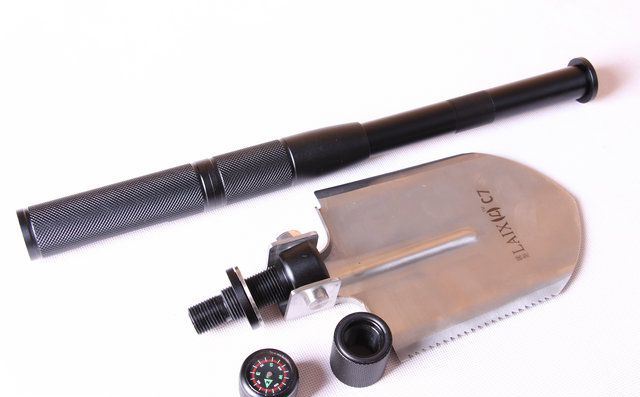 睐斯C7伸缩柄兵工铲 伸展长度:69cm 折叠长度:51.5cm 锹面尺寸:18*13cm 刀刃长度:12.1cm 厚度:3.0mm 重量:约1100g (含包装物) 刃材:进口不锈钢 柄材:加厚航空铝材+发黑色 包装:迷彩牛津布袋子,可挂腰上 特点:手柄拉缩型,方便折叠,当手柄拉尽时,再反时针扳转手柄,螺纹已紧.收回时,顺时针反回,再拉回,完成手柄伸缩程序.