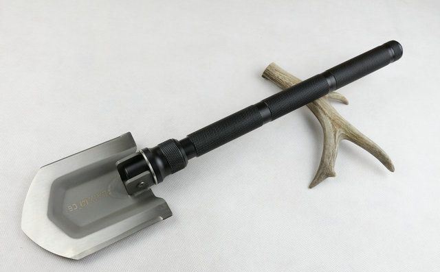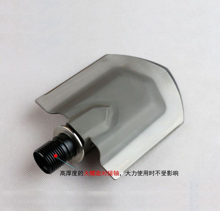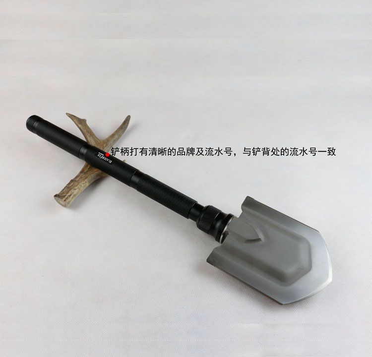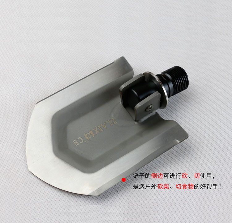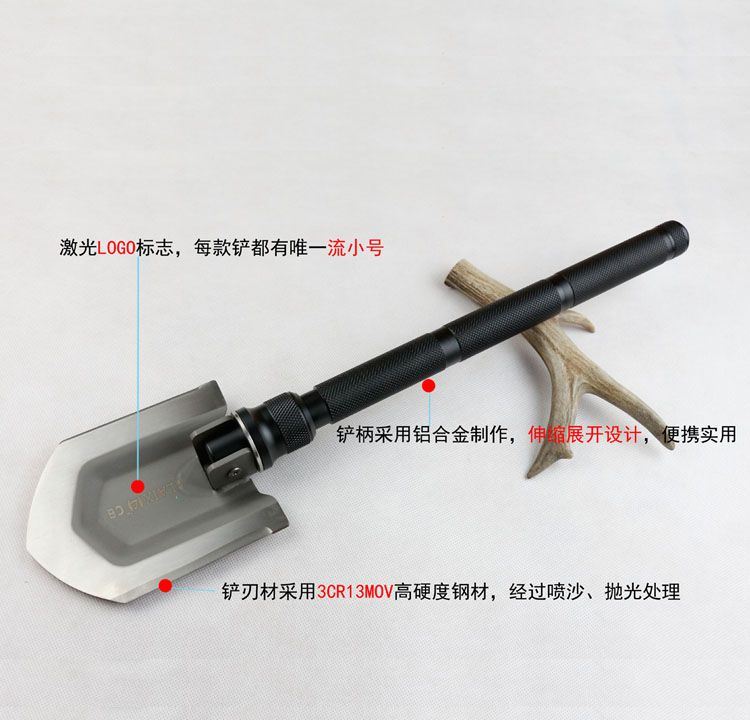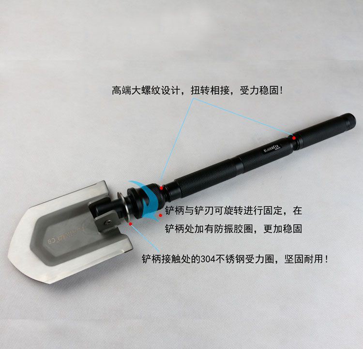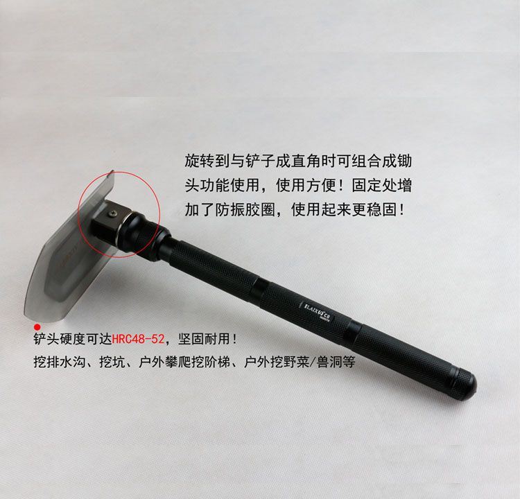 长度: 46.5cm 锹面尺寸: 13.2*10.8cm 刀刃长度:8.5cm 厚度:3.1mm 重量:750约g (含包装物) 刃材:进口不锈钢 柄材:加厚航空铝材 包装:迷彩牛津布袋子,可挂腰上,尾锥镶有目前最硬尖的钨钢破窗器. 功能:有铲,锄 ,锯,刀,钨钢破窗器等功能,在生产工艺上采用上好淬火高碳钢,增加强度,抗磨损,抗腐蚀,耐高温等优势.