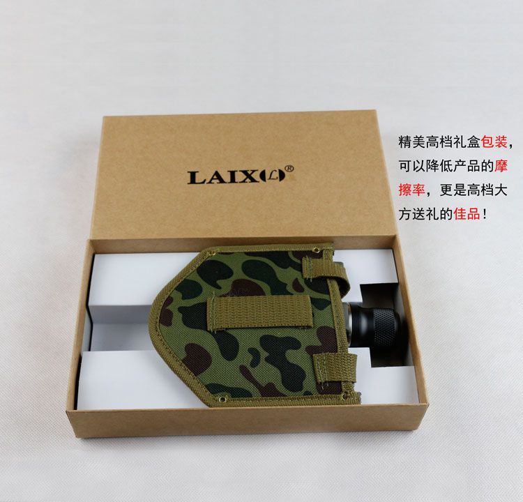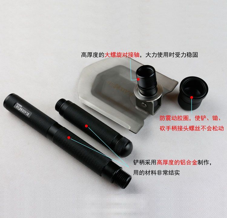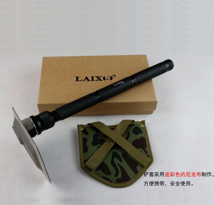睐斯C8多用工具铲(升级版) 长度: 46.5cm 锹面尺寸: 13.2*10.8cm 刀刃长度:8.5cm 厚度:3.1mm 重量:750约g (含包装物) 刃材:进口不锈钢 柄材:加厚航空铝材 包装:迷彩牛津布袋子,可挂腰上,尾锥镶有目前最硬尖的钨钢破窗器. 功能:有铲,锄 ,锯,刀,钨钢破窗器等功能,在生产工艺上采用上好淬火高碳钢,增加强度,抗磨损,抗腐蚀,耐高温等优势.
