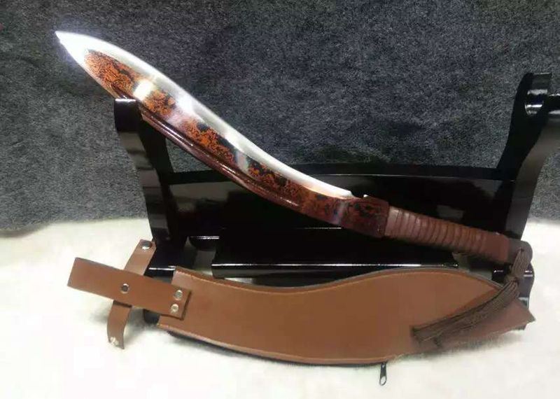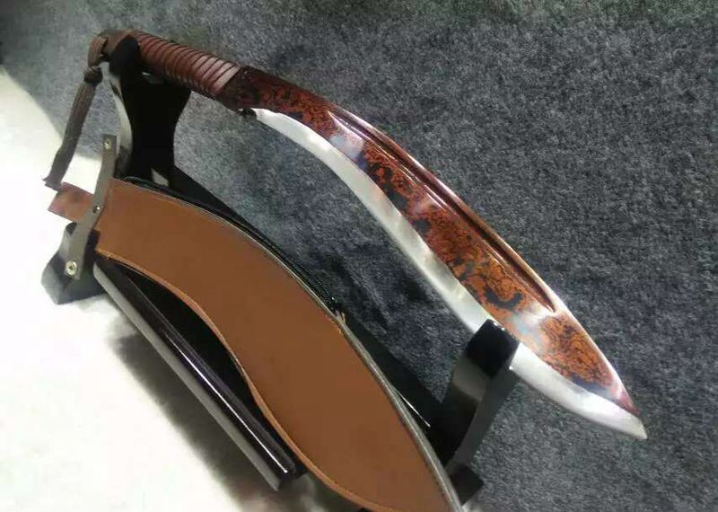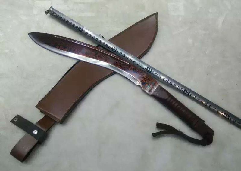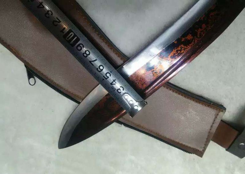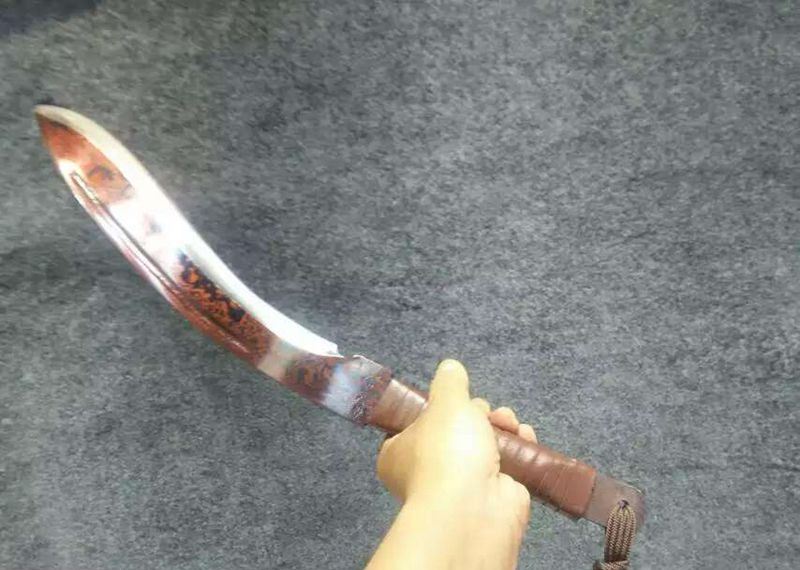 淬红花纹钢砍铁尼泊尔刀 全长:47 刃长:33 刃宽:5.0 材质:高温处理花纹钢 高硬度附带砍铁