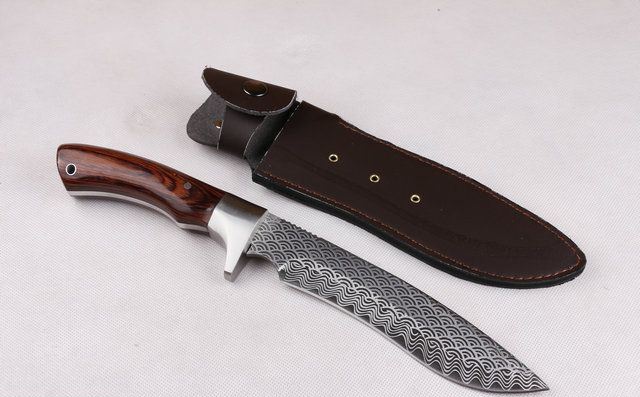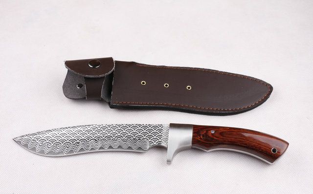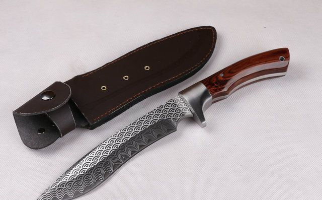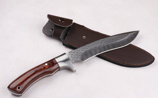 全 长:31.6cm 刃 长:16cm 柄 长:13.5cm 刃 宽:3.6cm(最宽处) 刃 厚:5.3mm 刃 材:7CR17MOV 硬 度:58HRC 刀 柄:彩木柄 表 面:腐蚀纹 重 量:650克(含包装) 备 注:原厂彩盒,优质真牛皮套