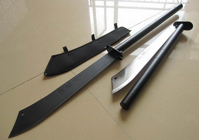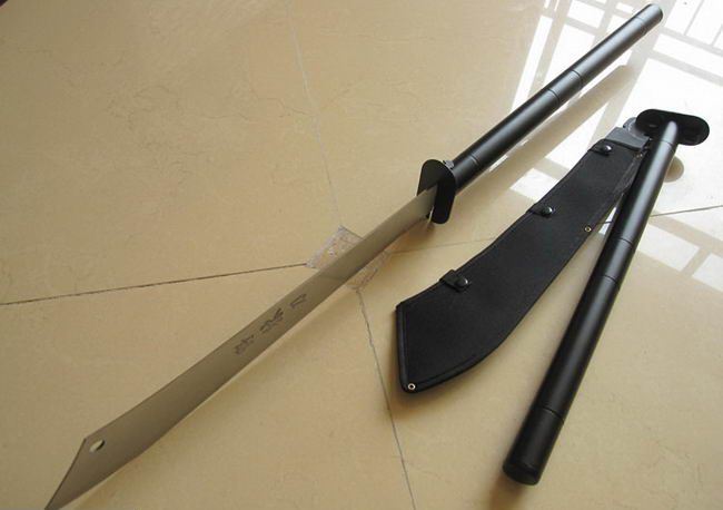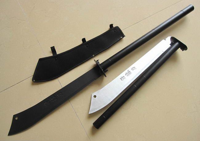 打开全长:96cm闭合长(管柄长度):50cm刃 长:45.5刃 厚:0.3刃 材: 420不锈钢刀刃硬度: 55HRC表面处理:粗纹黑漆刀柄材料:铁管刀 鞘:尼龙套重 量:1050克(含套) 该刀实为大沙刀的折叠型,身材比大沙刀稍微缩小了一点。携带方便,隐秘性强。拉动手柄顶端的弹簧开关,即可将刀身折叠起来。直接拔开刀身就可打开,非常方便。打开之后比较牢固,实用性较强。不过,关闭的时候一定要小心,不要被闸到手了。