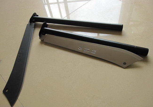 折叠式野狼刀(黑版) 打开全长:96cm闭合长(管柄长度):50cm刃 长:45.5刃 厚:0.3刃 材: 420不锈钢刀刃硬度: 55HRC表面处理:粗纹黑漆刀柄材料:铁管刀 鞘:尼龙套重 量:1050克(含套) 该刀实为大沙刀的折叠型,身材比大沙刀稍微缩小了一点。携带方便,隐秘性强。拉动手柄顶端的弹簧开关,即可将刀身折叠起来。直接拔开刀身就可打开,非常方便。打开之后比较牢固,实用性较强。不过,关闭的时候一定要小心,不要被闸到手了。