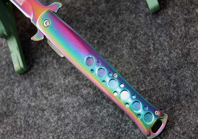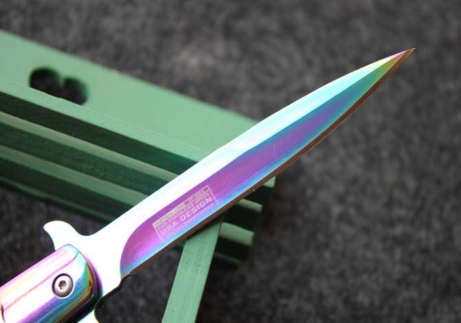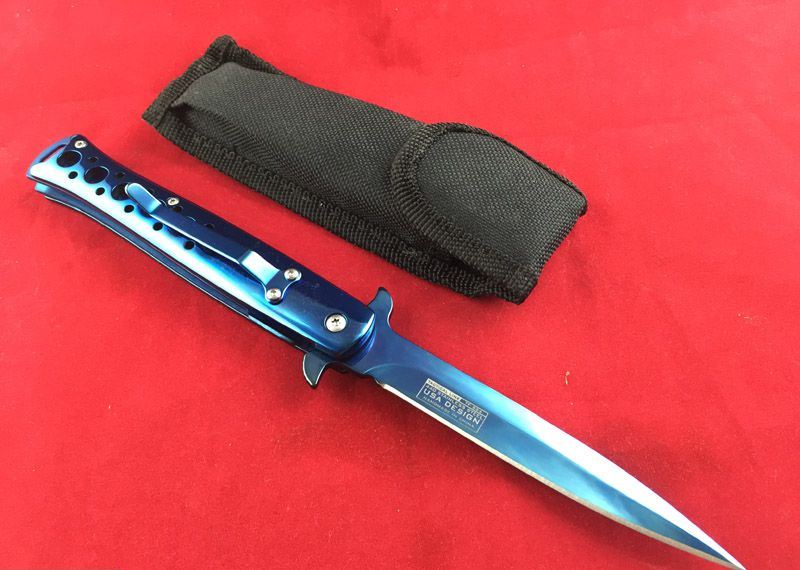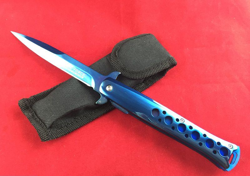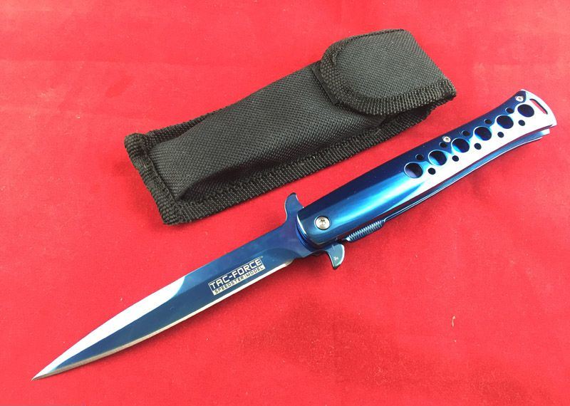 TAC-FORCE全钢蓝剑鱼折刀 全长:22.5cm 刃长:12.5cm 刃厚:0.3cm 重量:180克 柄表面:蓝 刃材料:440 TAC-FORCE全钢小剑鱼半自动折刀,自动快速打开机制,细长刃身,如同箭鱼长喙,有超强穿刺能力,锋刃。