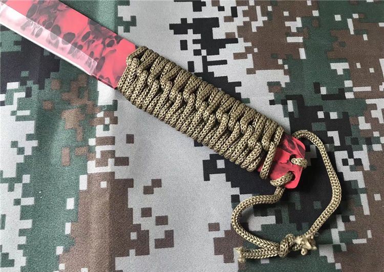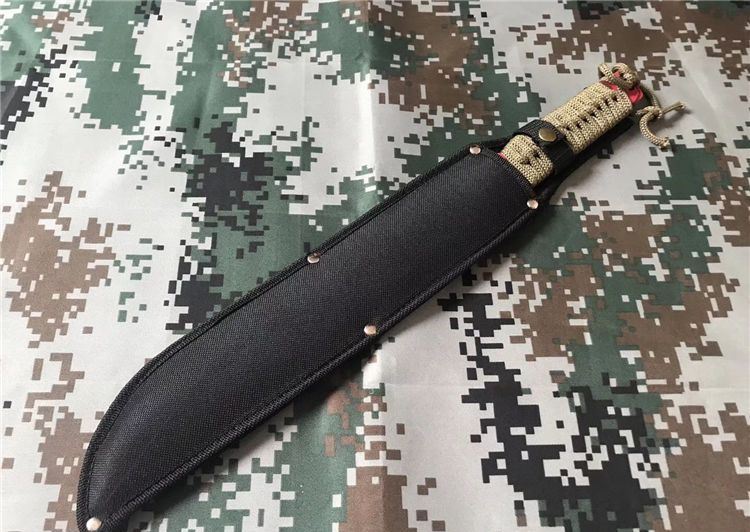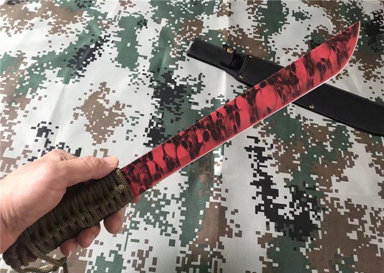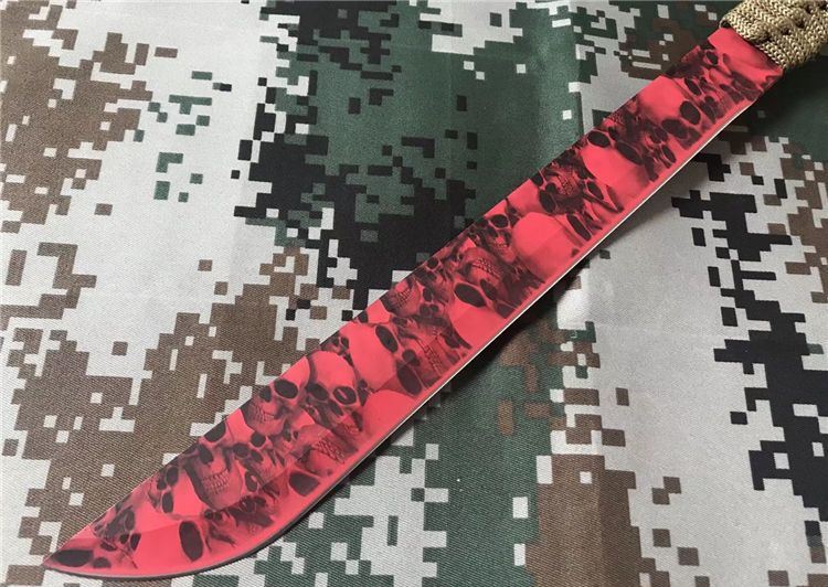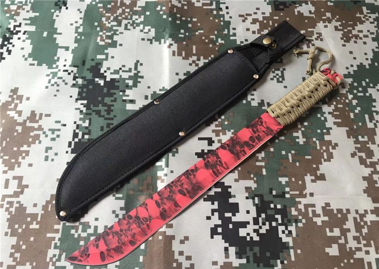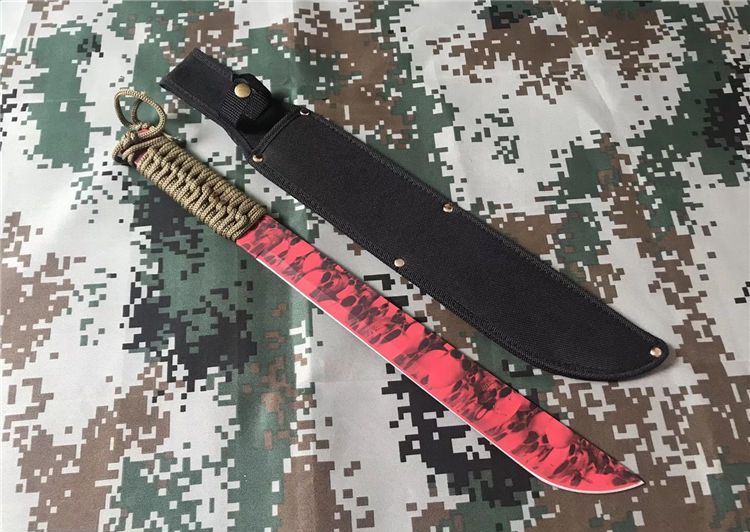 MTech僵尸血色刀 全 长:45.5cm 刃 长:33.5cm 刃 宽:3.9cm(最宽处) 刃 厚:4.1mm 柄 长:12cm 表 面:披覆,骷髅头图案 刃 材:420 硬 度:56HRC 柄 材:一体全柄+绑绳 重 量:544克(含包装) 包 装:尼龙套、彩盒