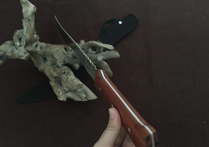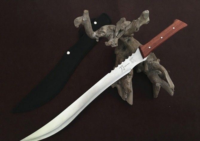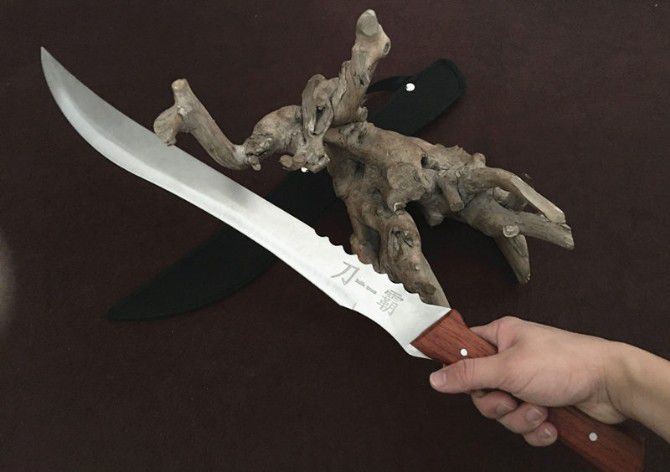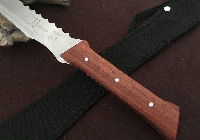 一体刀霸 全 长:68cm 刃 长:50cm 柄 长:18cm 刃 厚:50mm 刃 宽:4cm 合 重:720g(连刀套) 钢 材:440 柄 材:红木
