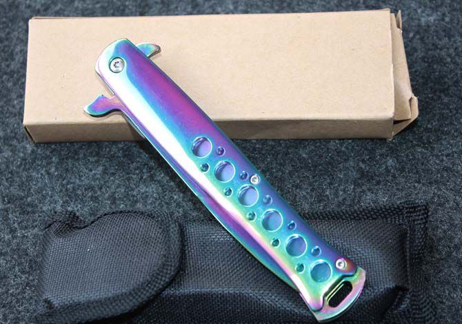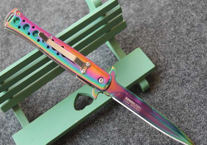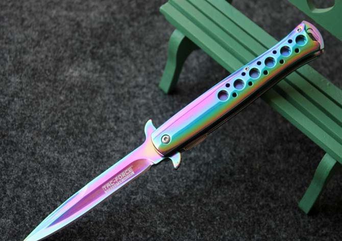TAC-FORCE全钢剑鱼(彩钛色) 全长 :22.5CM 刃长 :10.5CM 柄长 :12.5CM 刃厚 :0.3CM 重量 :180克 柄表面:彩钛色 刃材料:440 TAC-FORCE全钢小剑鱼半自动折刀,自动快速打开机制,细长刃身,如同箭鱼长喙,有超强穿刺能力。