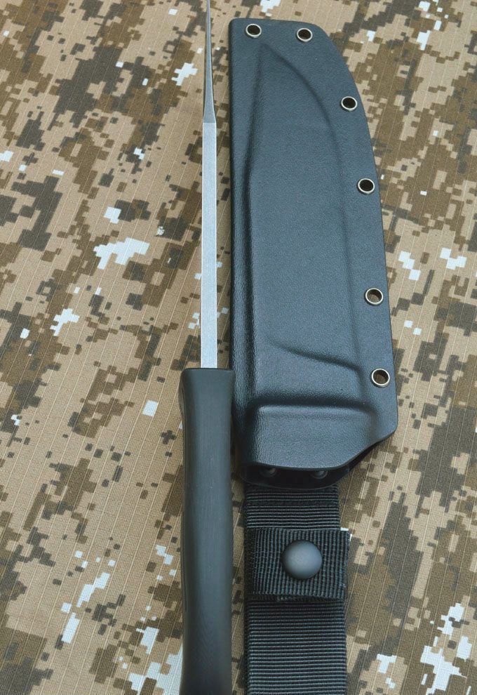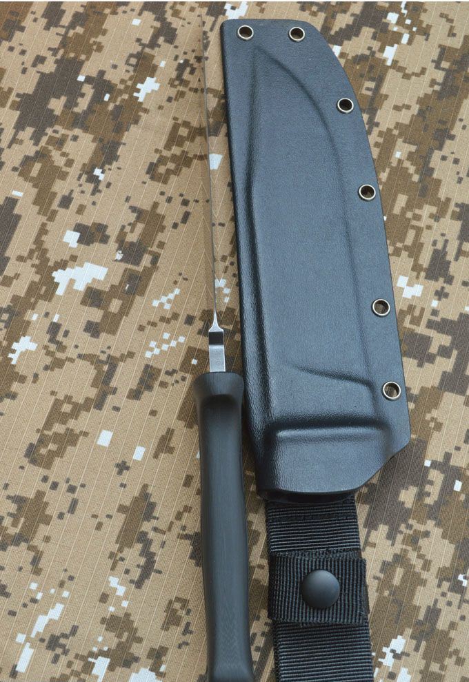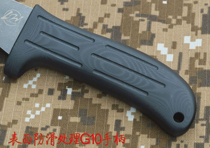 刃材:军工D2 全长:312mm 刃长:191mm 柄长:121mm 刃厚:6.2mm 刃宽:41mm 表面:沧桑石洗 硬度:HRC59-60 (真空油淬热处理) 手柄:G10+表面防滑处理 刀鞘:进口Kydex鞘 包装:黑色礼品盒 刀重:约375G 总重(包括包装盒等):约700G