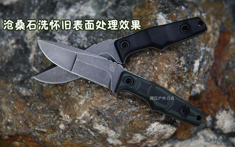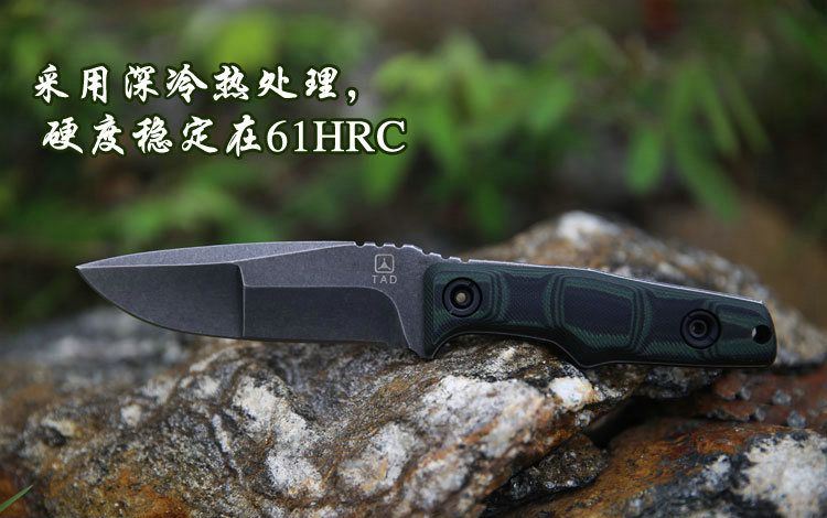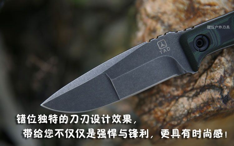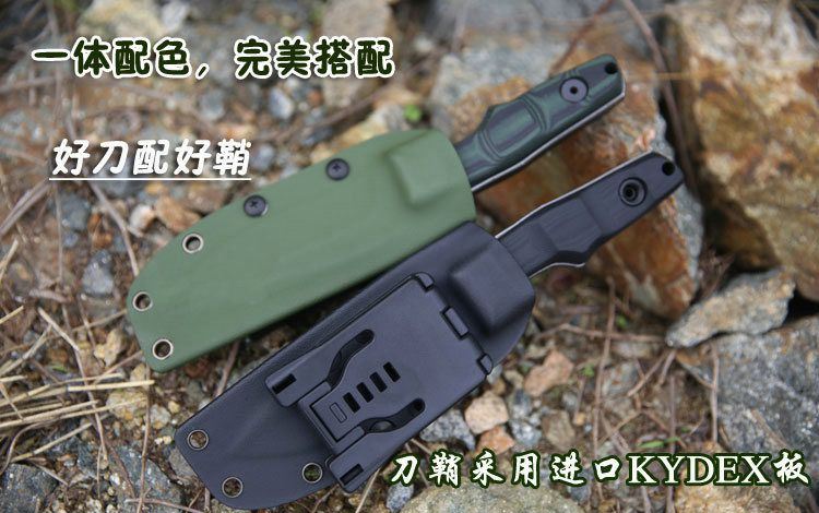 材质:9CR18MOV 手柄:黑绿10MM G10材质 刀鞘:进口2.0厚Kydex 总长:21.7CM 刃长:9.8CM 刃宽:3.1CM 刃厚:5.34MM 净重:0.265KG(不含刀鞘) 硬度:60HRC 表面处理:沧桑石洗效果