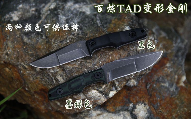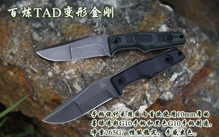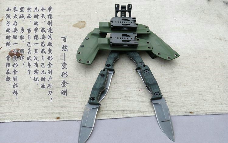 百炼变形金刚刀 材质:9CR18MOV 手柄:黑绿10MM G10材质 刀鞘:进口2.0厚Kydex 总长:21.7CM 刃长:9.8CM 刃宽:3.1CM 刃厚:5.34MM 净重:0.265KG(不含刀鞘) 硬度:60HRC 表面处理:沧桑石洗效果
