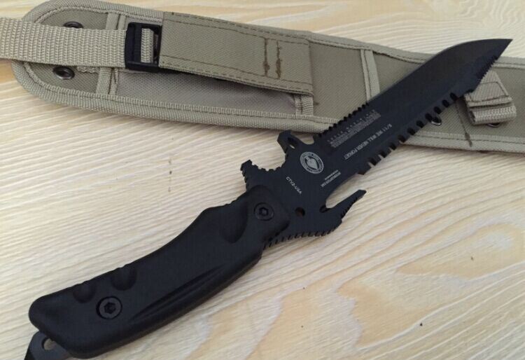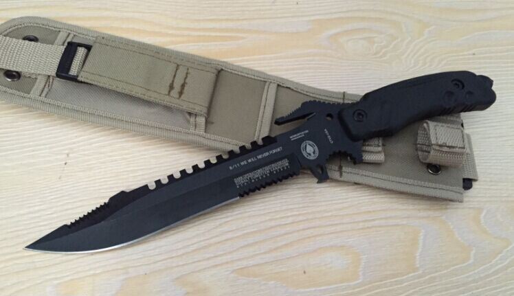 2015新款夜魔911战术直刀 全 长:355mm 刃 长:180mm 柄 长:130mm 宽:35mm 刃 厚:6.3mm 刃 材:5Cr13Mov 重 量:520g(含包装) 硬 度:57HRC 表 面:氧化黑 柄 材:ABS塑胶 锁 型:定锁 其 他:配尼龙战术刀套