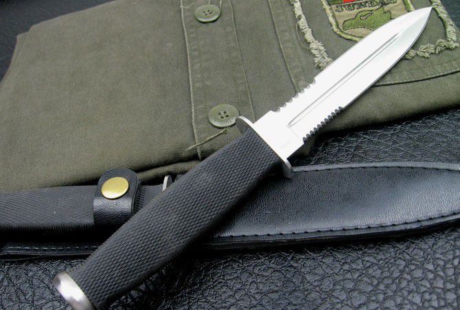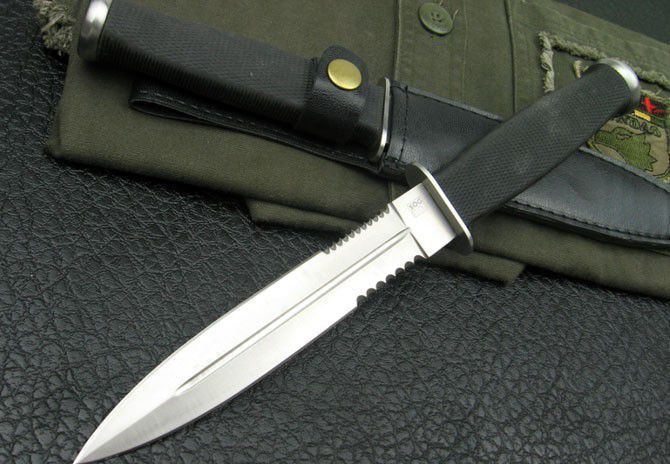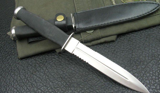 精仿SOG25双锋战士(钢本色) 全长:29.5 刃长:17 刃厚:0.4 刃宽:2.6 硬度:56 柄长:12.5 柄材:一体龙骨柄+橡胶 重量:250克(含鞘) 附带皮革刀鞘