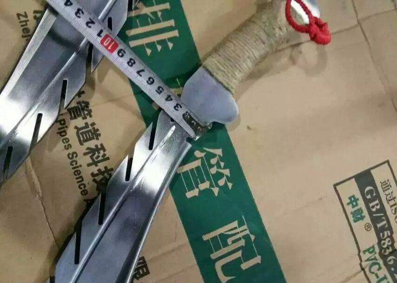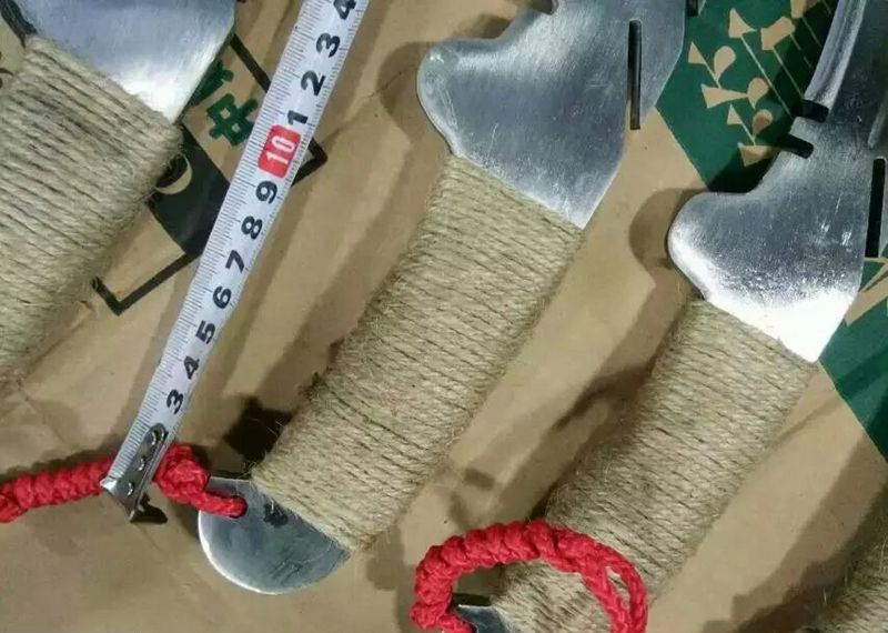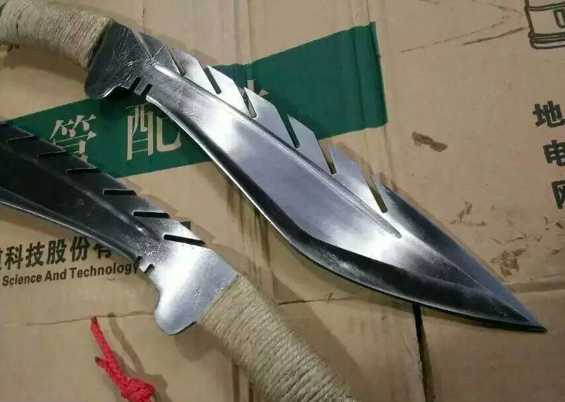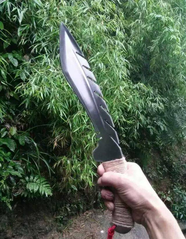 高猛钢带齿小狗腿刀 全长:45厘米 刃长:30厘米 柄长:12厘米 厚度:0.9厘米 材质:一体锰钢 其他:带有刀套