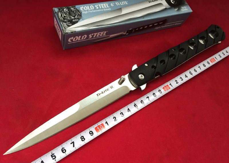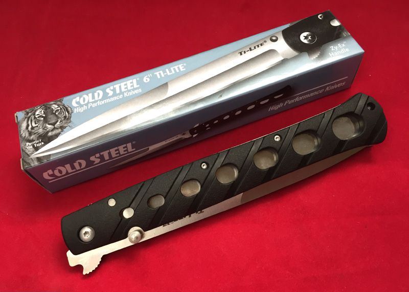 Cold Steel冷钢 6 英寸刃 Ti-Lite 26sxp战术折刀(玻纤柄), 来自1950经典设计。刃材料采用AUS-8 , 刀柄由43%尼龙树脂压铸,重量轻量化。它也有高质量的不锈钢钢板锁和衬垫。它还附带一个小和不引人注目的不锈钢口袋夹, 刀刃打开方式有俩,拇指柱和快来钩设计(轮齿边缘的挂拉口袋里可以迅速开刀)。