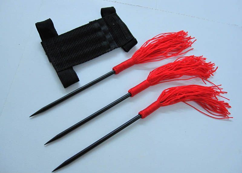 全长:15 半径(粗):0.5 钢材:420不锈钢 硬度HRC 52 单支重量:30克 整套重量:100克 配尼龙套(有伸缩带,可以绑腿) 每套包含3支大小一样的飞阵镖,尾段扎红绥