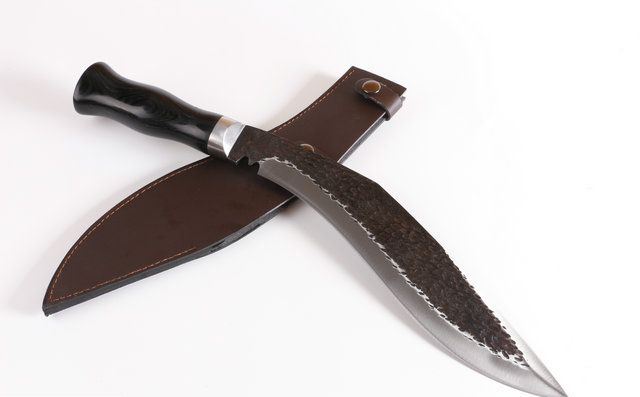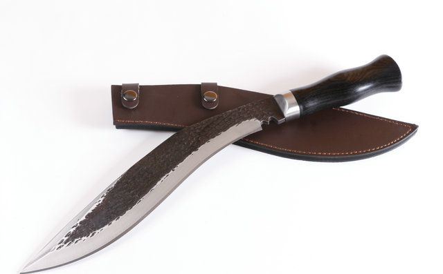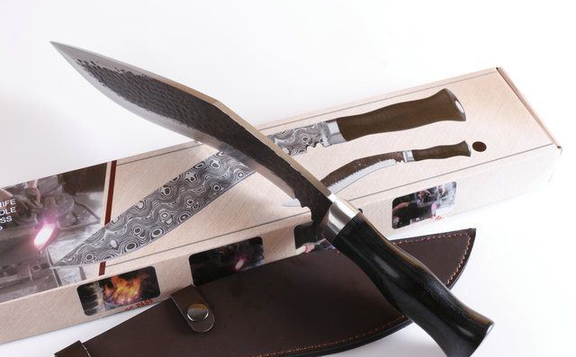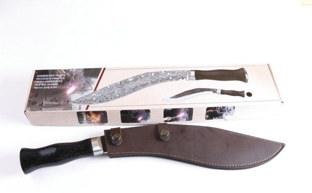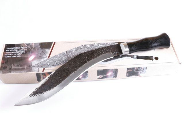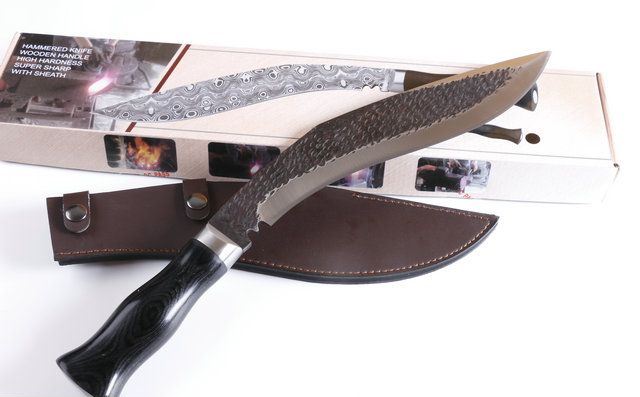 锻打黑狗腿(彩合装) 全 长:44.2cm 刃 长:27.6cm 柄 长:14cm 刃 宽:5.3cm(最宽处) 刃 厚:6.3mm 刃 材:7CR17MOV 硬 度:58HRC 刀 柄:彩木柄 表 面:纯锻纹 重 量:900克(含包装) 备 注:原厂彩盒,优质真牛皮套