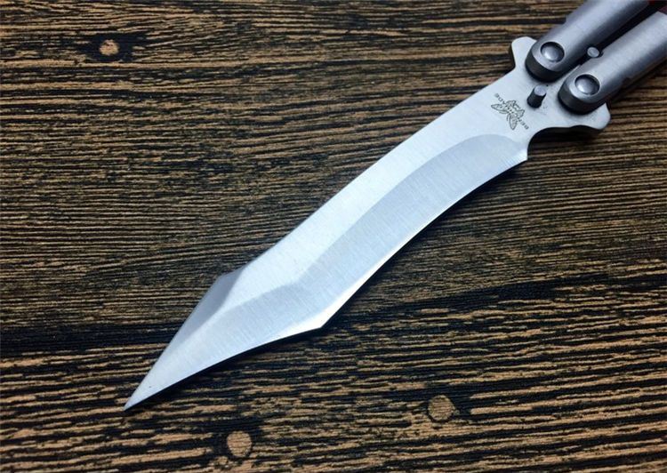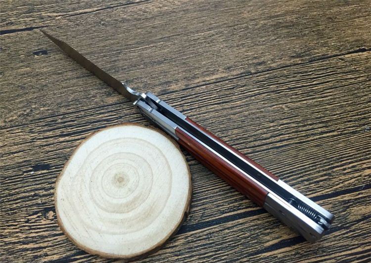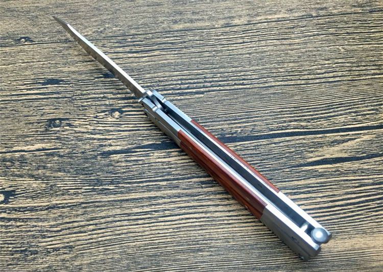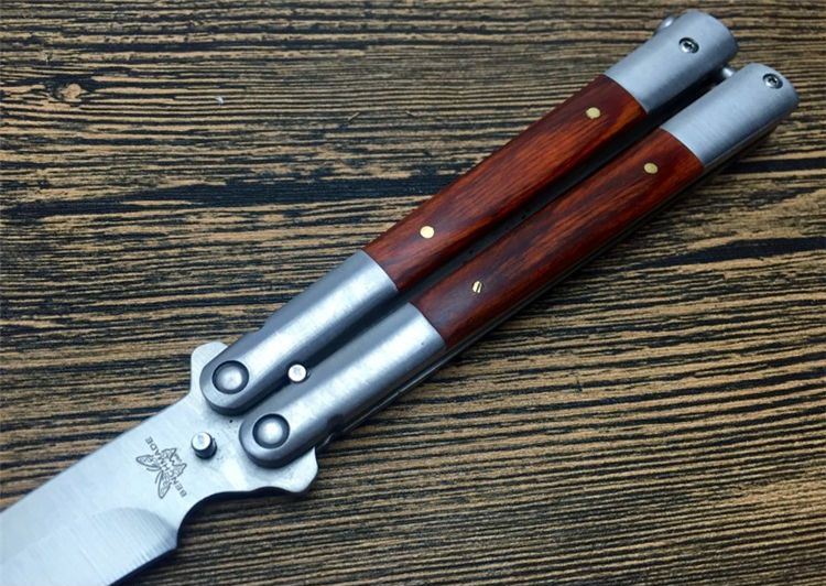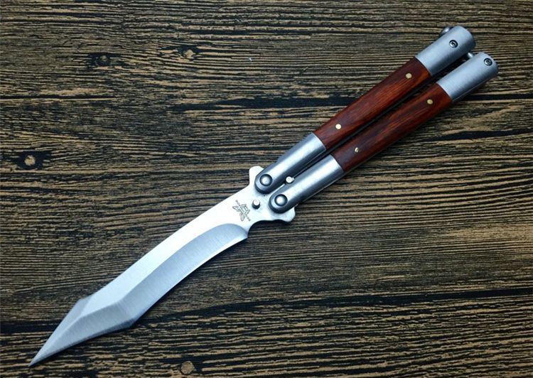 蝴蝶红木蝴蝶甩刀 全长:22.5cm 刃长:10cm 柄长:12.5cm 刃宽: 1.9cm 刃厚:0.26cm 刃材:5Cr13MoV 柄材:彩木+钢头 硬度:56HRC 重量:140克 表面处理:砂光