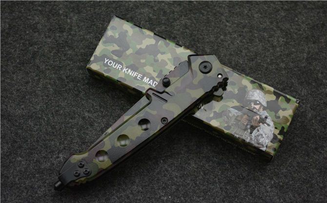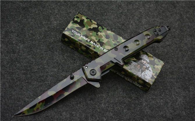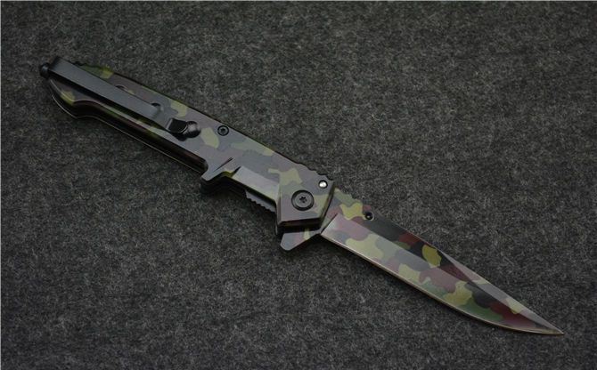 全长:22.0cm 刃长:9.0cm 柄长:12.5cm 刃厚:2.8mm 刃宽: 1.7cm 刃材: 420 柄材: 钢柄 硬度: 55HRC 毛重: 180克 表面: 迷彩 锁型: 侧锁快开 其他: 带坚固背夹、玻璃撞针