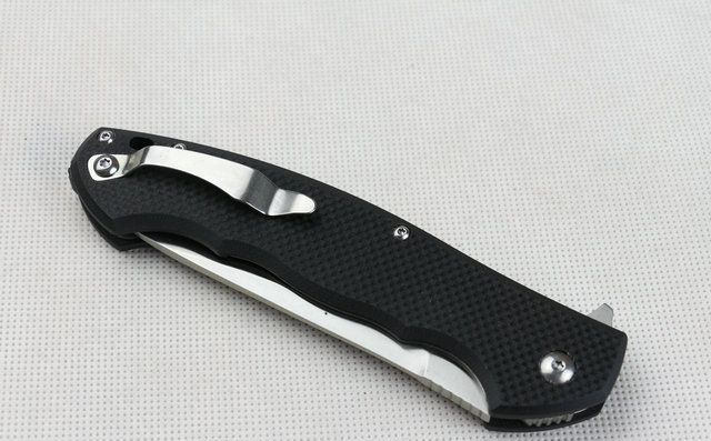 全 长:23.2cm 刃 长:10.2cm 柄 长:13cm 刃 宽:2.8cm 刃 厚:4.0cm 刃 材:440 硬 度:58HRC 表 面:砂光 柄 材:黑色G10 锁 型:线锁 其 他:原厂白盒