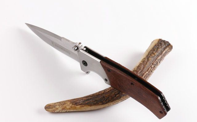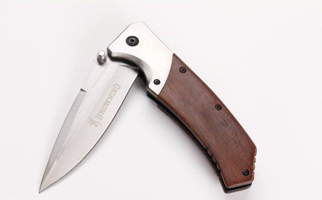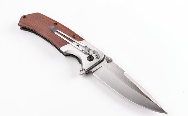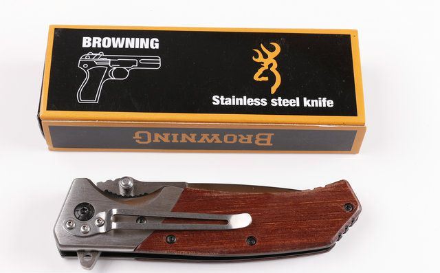 勃朗宁FA19快开折刀 全 长:22.5cm 刃 长:9.8cm 柄 长:12.7cm 刃 宽:2.8cm(最宽处) 刃 厚:3.2mm 刃 材:5CR13MOV 硬 度:56HRC 刀 柄:拉丝钢头+酸枝木。 表 面:沙光伴拉丝 重 量:200克 配原厂包装