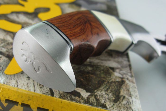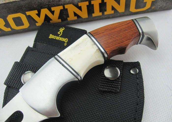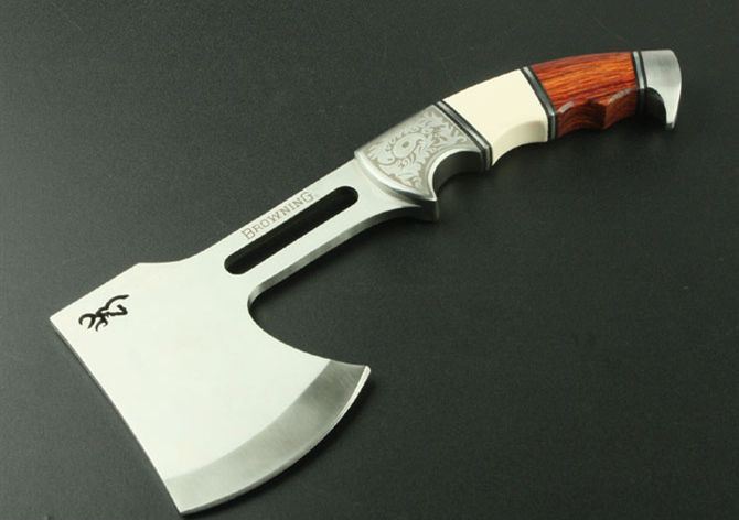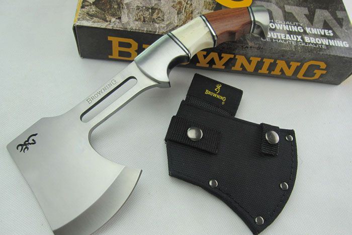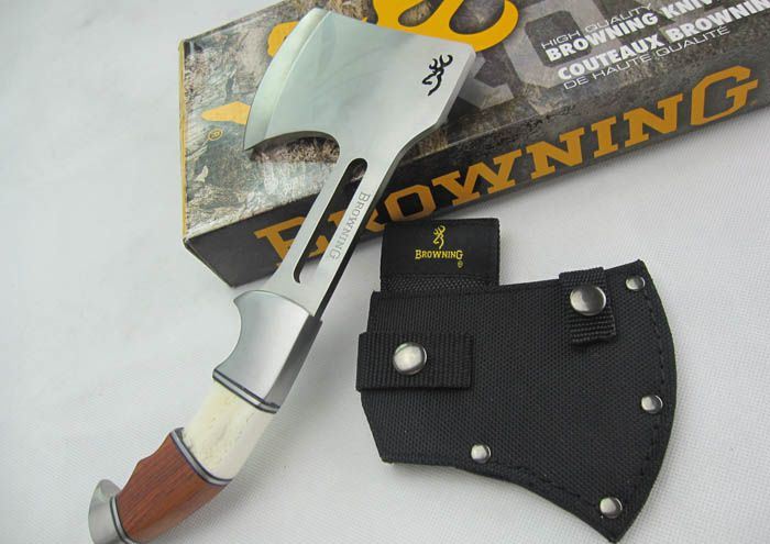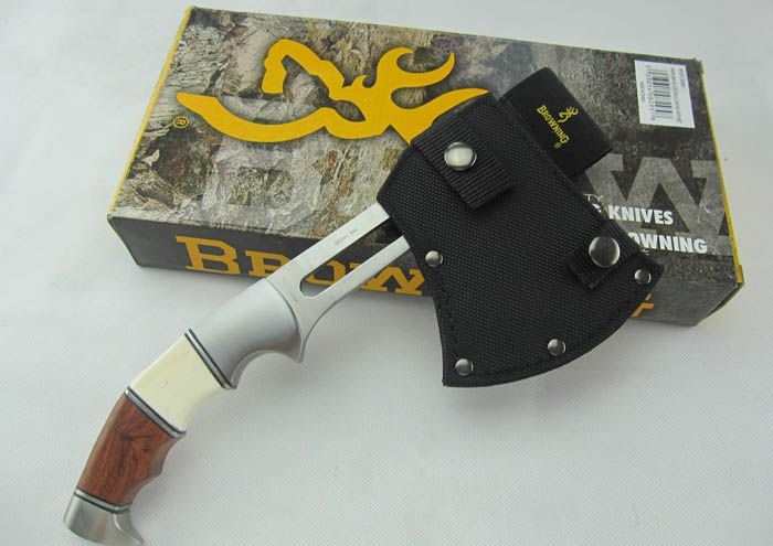 勃朗宁888猎斧(代工正品) 全 长:27.0cm 刃 长:8.5cm 柄 长:13.5cm 刃 厚:5.3mm 刃 材:7Cr17 硬 度:59HRC 刀 柄:兽骨+红酸枝名贵木材+钢头 表 面:砂光 重 量:830.0克 备 注:原品包装及尼龙套