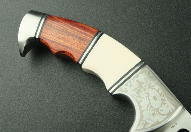全 长:27.0cm 刃 长:8.5cm 柄 长:13.5cm 刃 厚:5.3mm 刃 材:7Cr17 硬 度:59HRC 刀 柄:兽骨+红酸枝名贵木材+钢头 表 面:砂光 重 量:830.0克 备 注:原品包装及尼龙套