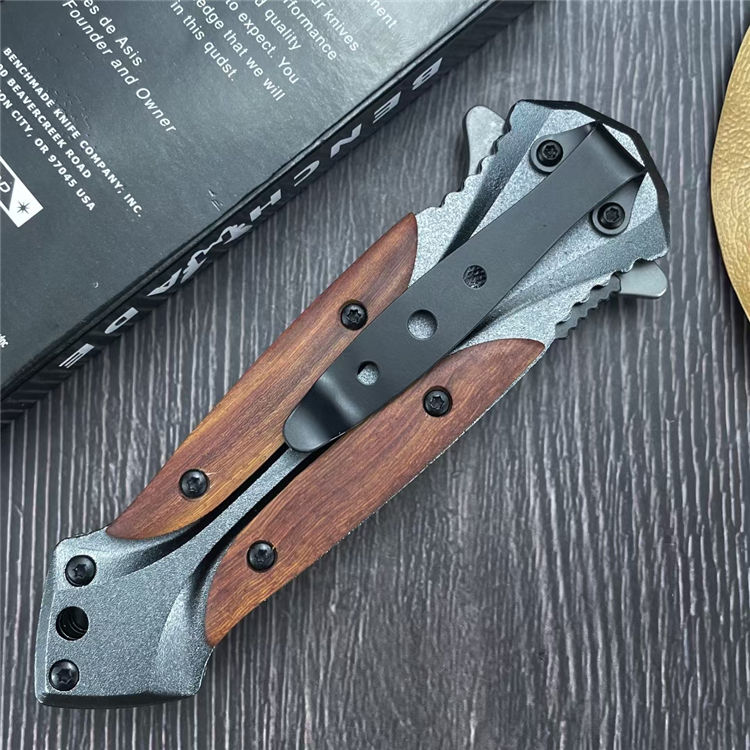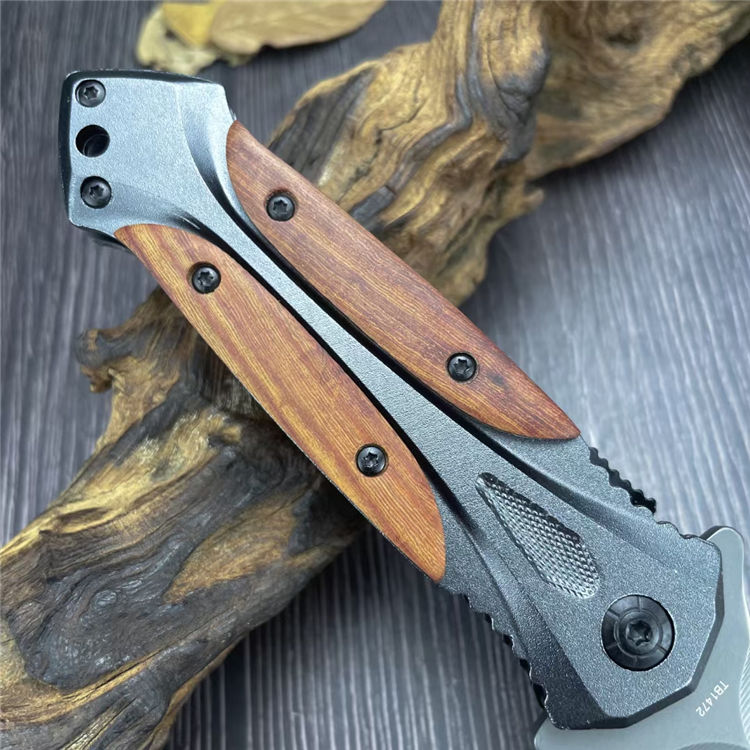 刃材:3Cr13 硬度: 56HRC 全长:20CM 刃长:8.5CM 刃厚: 0.27CM 刃宽:2CM (最宽处) 柄长: 11.5CM 重量:115克 涂层:灰钛 柄材: 红木片 锁定: 快开