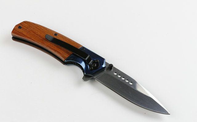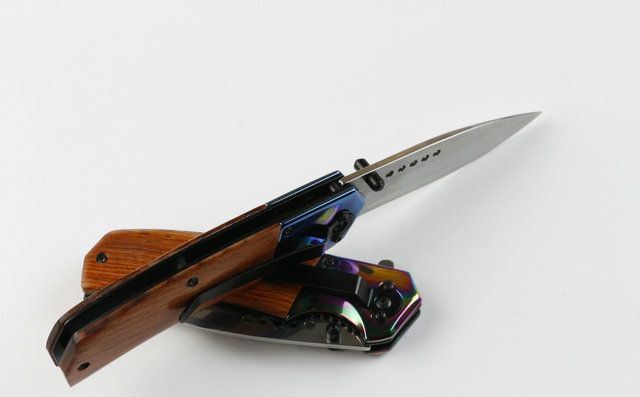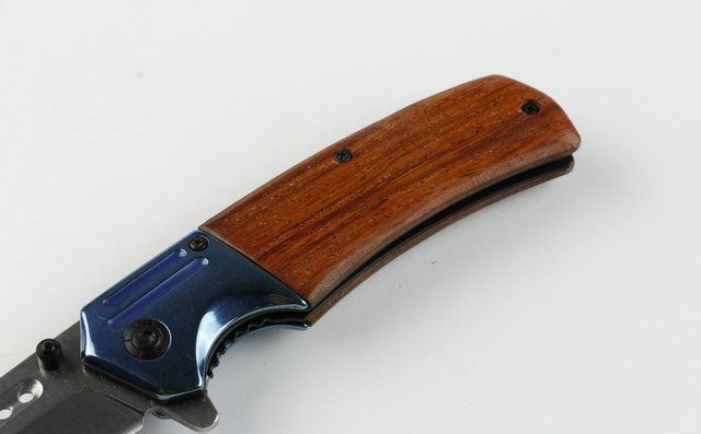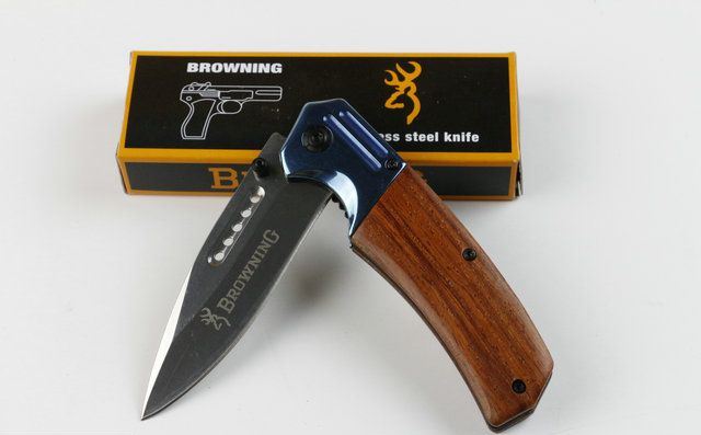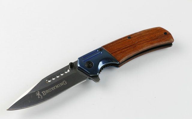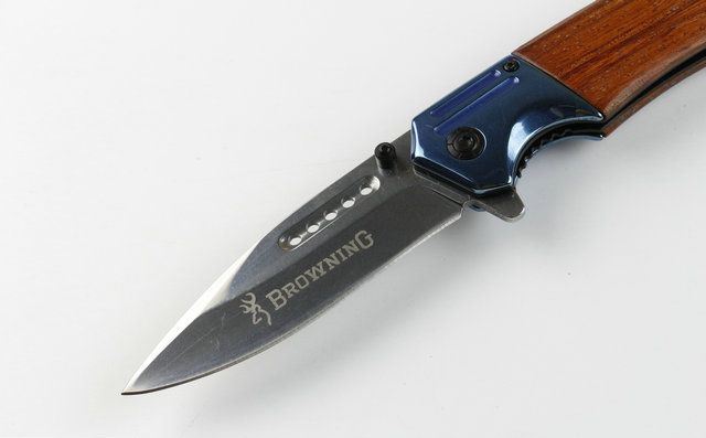 勃朗宁F78快开折刀(蓝钛) 全 长:20.2cm 刃 长:9.0cm 柄 长:11.5cm 刃 宽:2.7cm(最宽处) 刃 厚:2.8mm 刃 材:5CR13MOV 硬 度:56HRC 刀 柄:彩钛钢头+酸枝木。 表 面:石洗镜光 重 量:200克 配原厂包装