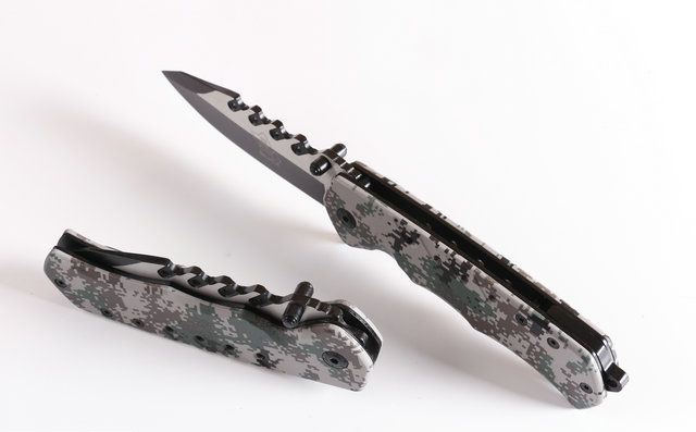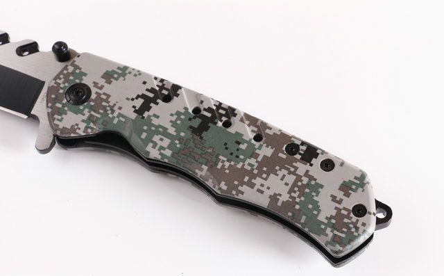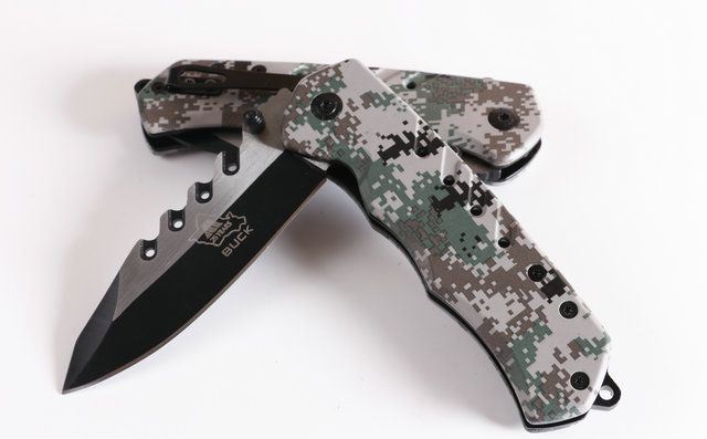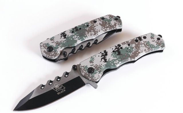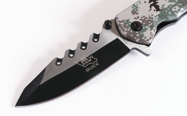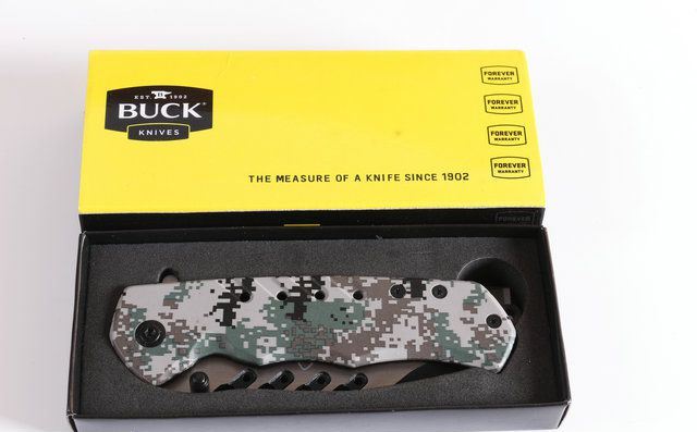 巴克DA23边孔快开折刀(迷彩) 全长:22.5 刃长:9.5 刃宽:3 刃厚:0.35 柄长: 12.5 刃材:440 硬度:57HRC 柄材:全钢 锁型:背锁 刀净重:280克 总重量:300(含纸盒) 高档纸盒包装
