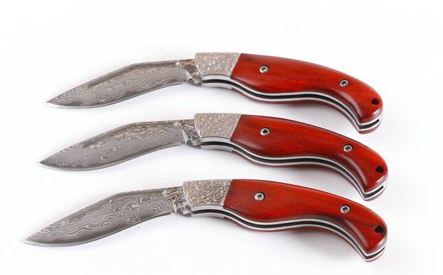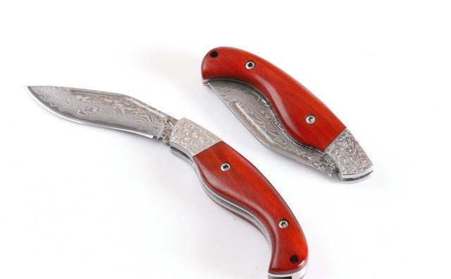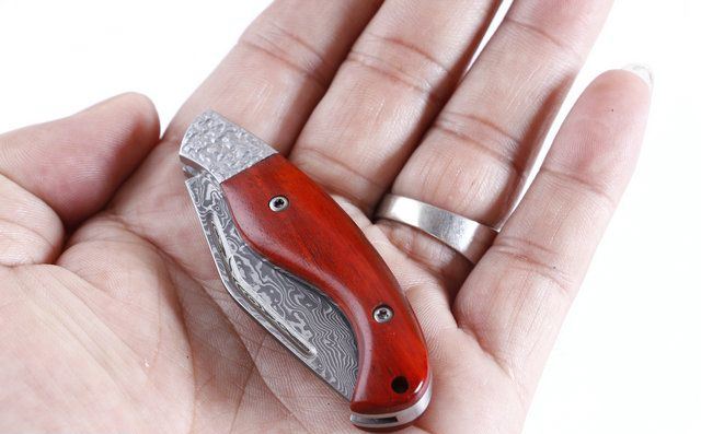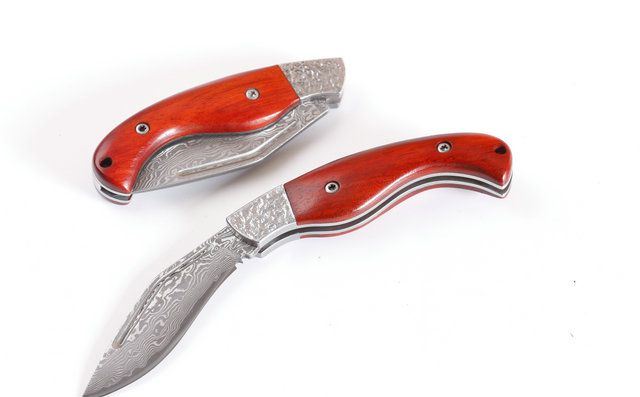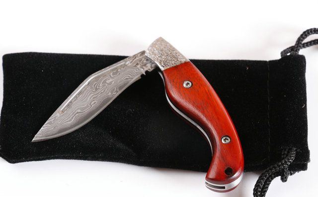 大马士革钢小狗腿口袋折刀 全 长: 11.6cm 刃 长: 5cm 刃 宽: 1.5cm(最宽处) 闭 合: 6.9cm 硬 度: 56HRC 刃 厚: 0.21cm 重 量: 60克(含包装) 包 装:黄盒 表 面: 纯手工制造 刃 材: 大马士革 柄 材: 天然科檀木 锁 闭: 无锁