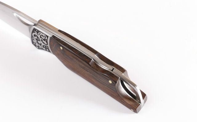 全 长: 19.2cm 刃 长: 8.0cm 刃 宽: 2.9cm(最宽处) 闭 合: 11.2cm 硬 度: 57HRC 刃 厚: 0.28cm 重 量: 150克 表 面: 镜光 刃 材: 440C 柄 材: 全钢头雕花+鸡翅木 锁 闭: 传统式制尾锁 其 他: 尼龙套包装,刃口锋利