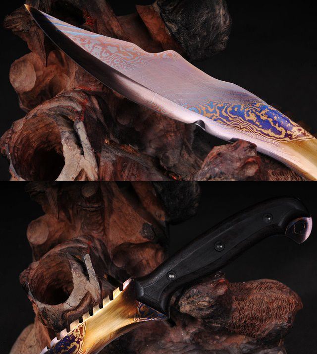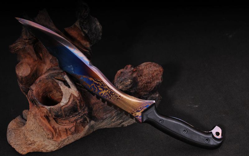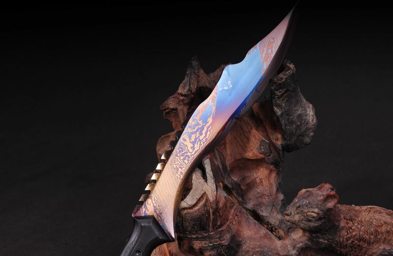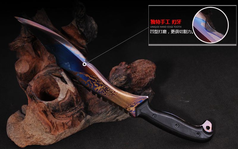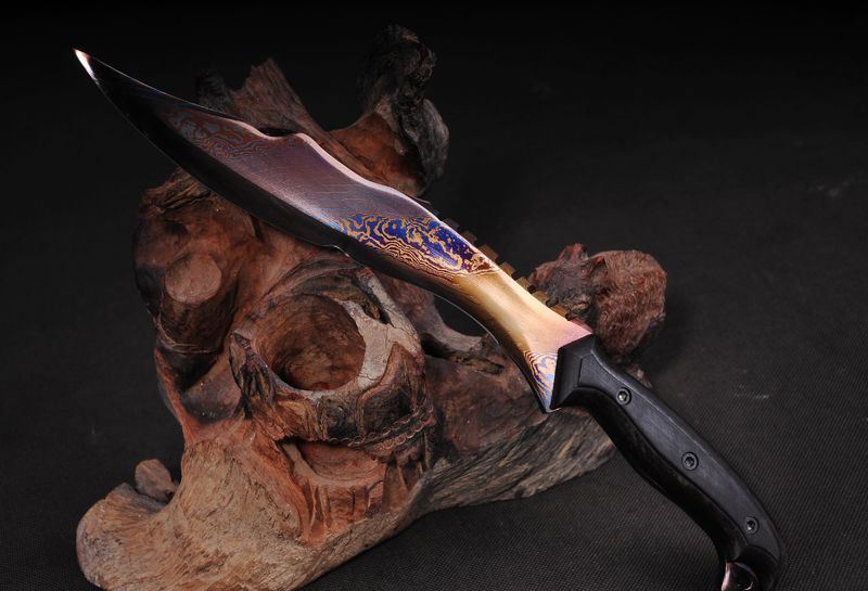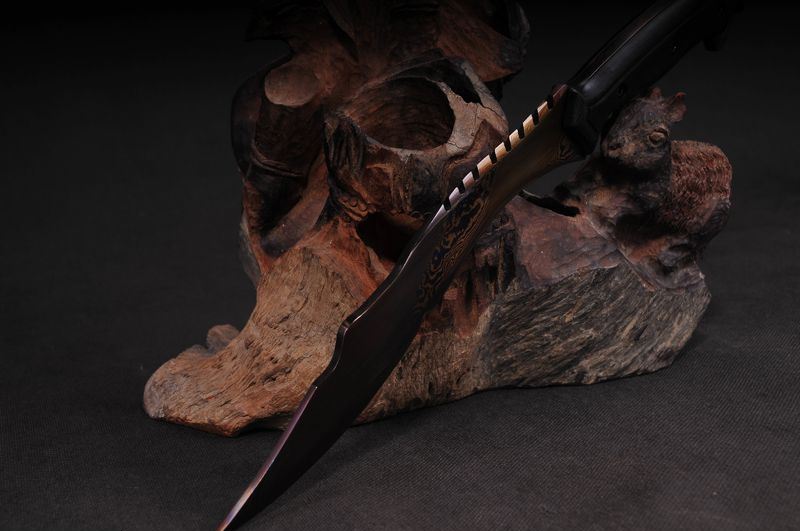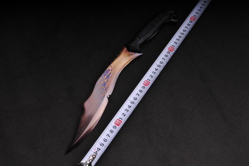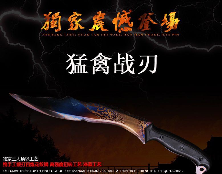 猛禽战刃 全长:40cm 刃长:26cm 柄长:13cm 刃长:淬蓝花纹钢 柄材:乌木 做工:手工锻打三层扭转纹,一体刀胚非常结实。 刀套:皮质刀套