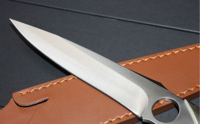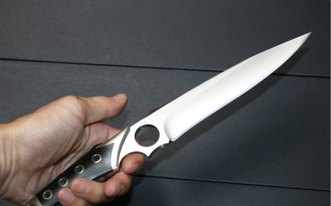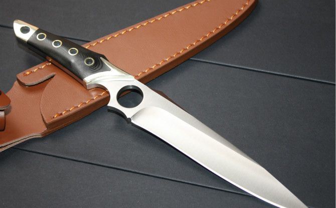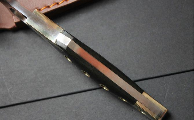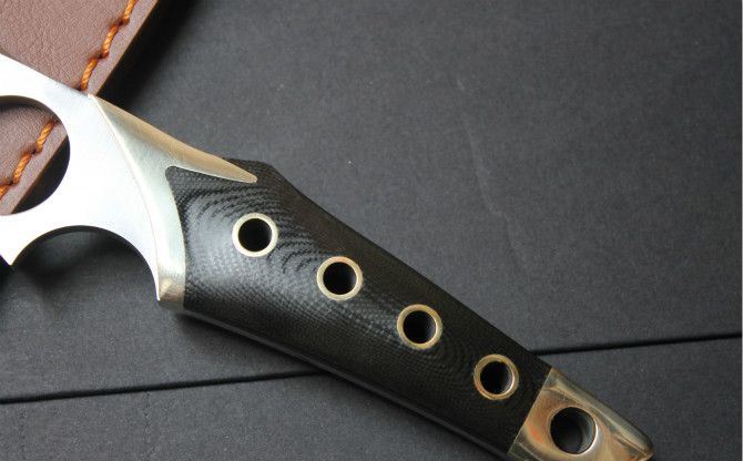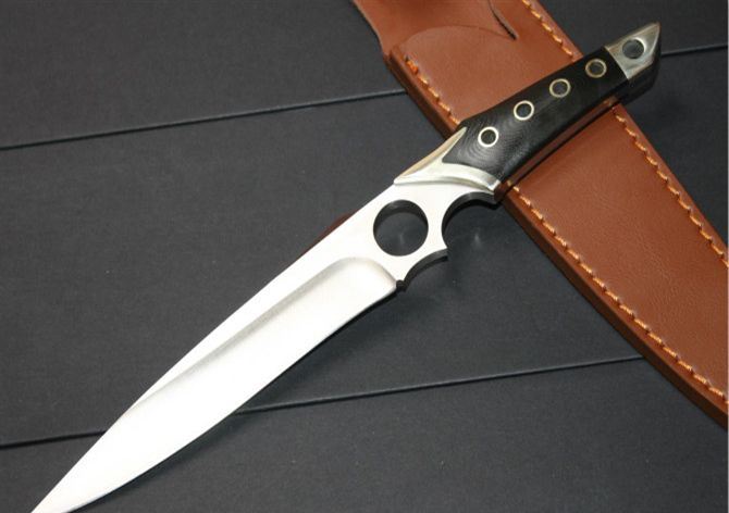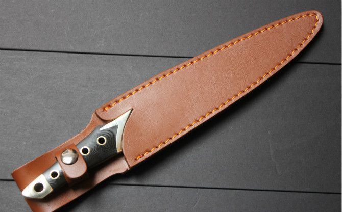 材 料:7cr17mov 长 度:30.5cm 厚 度:0.55cm 刃 长:16.5cm 柄 长:11.5cm 刃 宽:3cm 最宽处:3.5cm 硬 度:58-HRC 净 重:200 其 他:配头层牛皮套 毛 重:300克 净 重:200克 柄 材:白铜头 和 铜尾+黑色G10