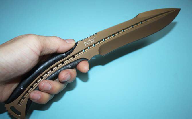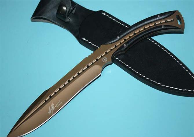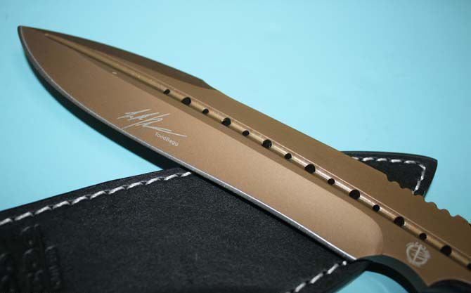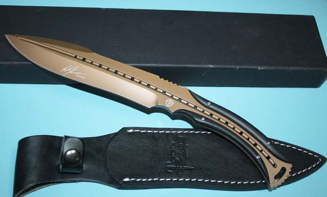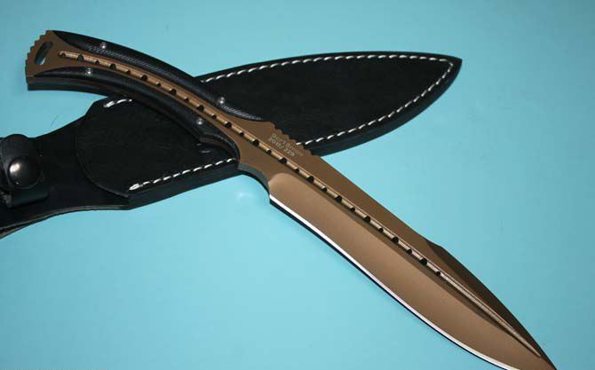 托德·贝格—征服者手工(咖啡色) 全 长:310mm 刃 长:162mm 柄 长:120mm 刃 宽:40mm 刃 厚:6mm 刃 材:9cr18mov 重 量:370g(含包装) 硬 度:59HRC 表 面:咖啡色版 柄 材:钢一体柄+G10条 锁 型:定锁 其 他:配牛皮套,本产品色彩新颖而出,市面第一例而且全是手工制作