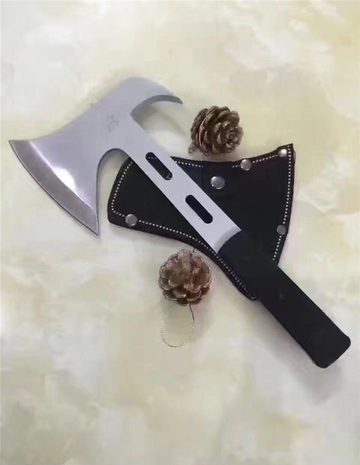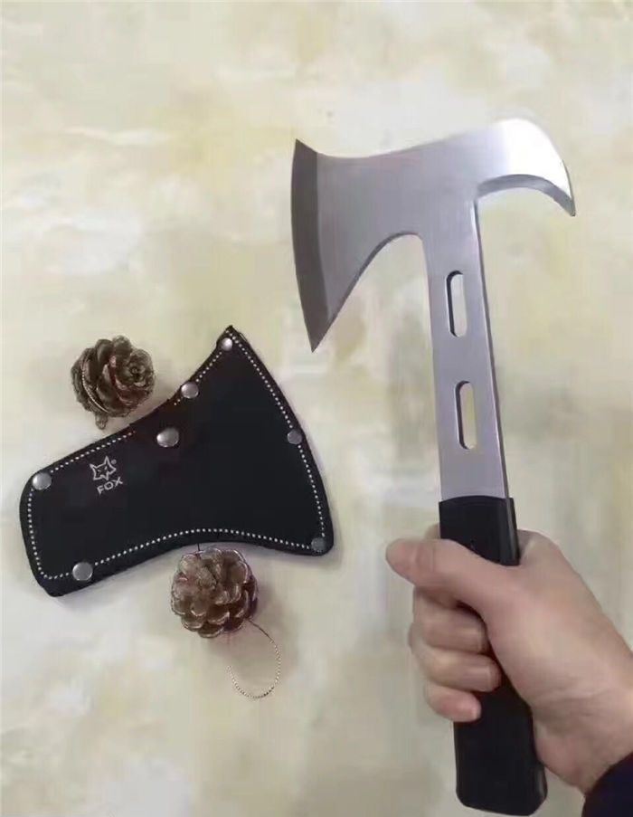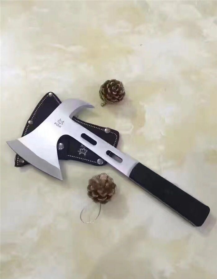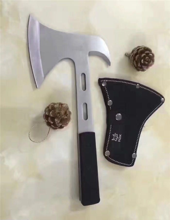 狐狸FOX开山斧 全长:27.7cm 刃宽:10.8cm 刃厚:0.48cm 刃材:5CR13 硬度:55HRC 表面:沙光 柄材:G10 柄长:12cm 净重:550克 毛重:600克 刀鞘:尼龙套 品质:高品质,OEM