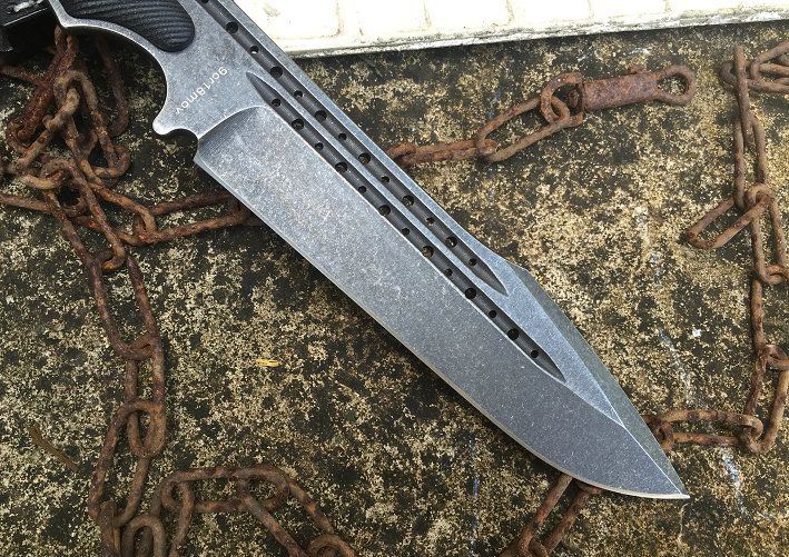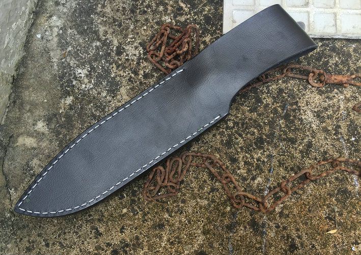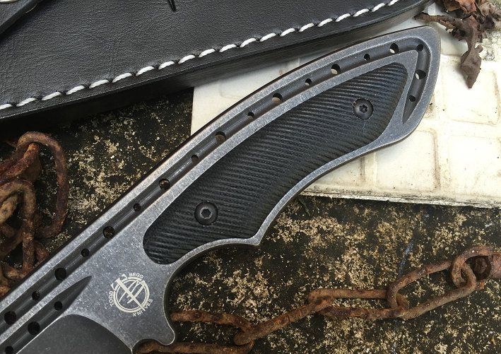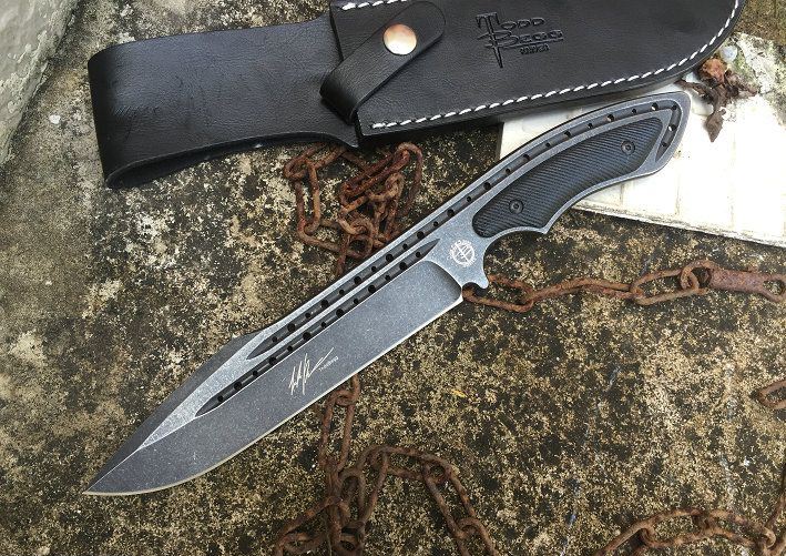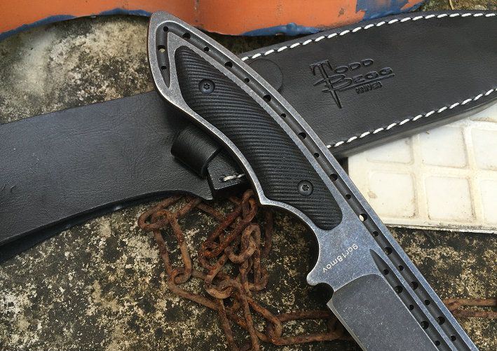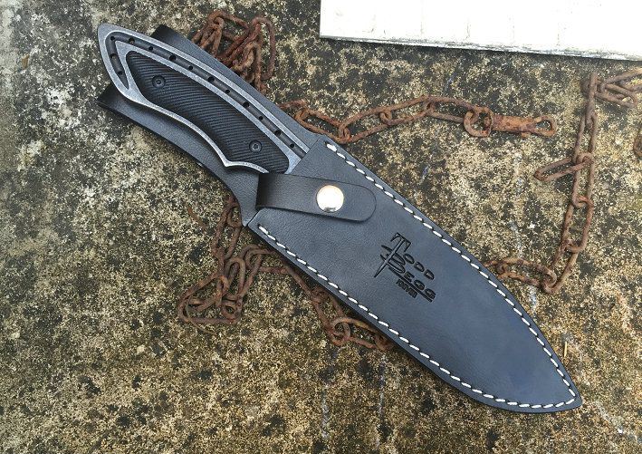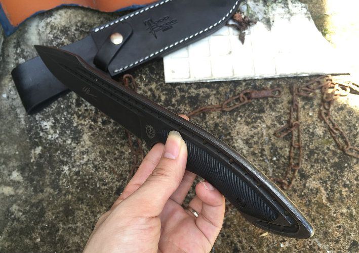 托德贝格电鳗直刀(手工版) 全 长:31.8mm 刃 长:17mm 刃 宽:4.3mm 刃 厚:6mm 刃 材:9cr18mov 重 量:380g(不含包装) 硬 度:59HRC 表 面:沧桑石洗 柄 材:钢一体柄+黑色G10 其 他:配头层牛皮套