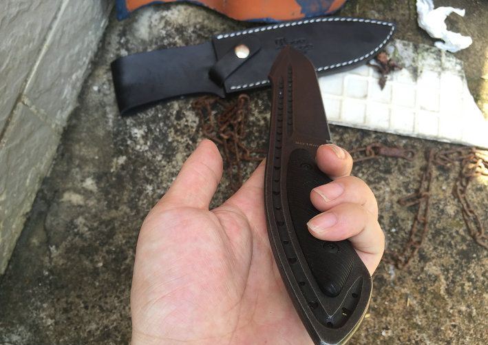 全 长:31.8mm 刃 长:17mm 刃 宽:4.3mm 刃 厚:6mm 刃 材:9cr18mov 重 量:380g(不含包装) 硬 度:59HRC 表 面:沧桑石洗 柄 材:钢一体柄+黑色G10 其 他:配头层牛皮套