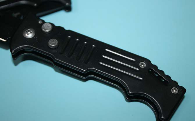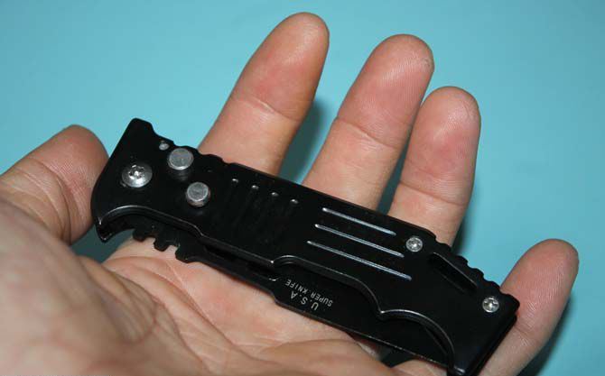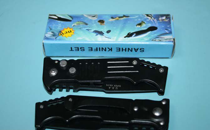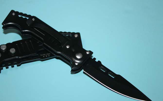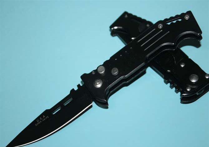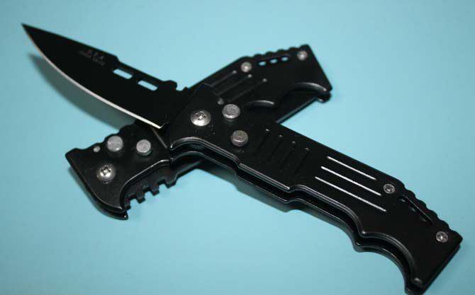 强力横开弹簧刀小号 全长:17cm 刃长:7.2cm 柄长:9cm 刃厚:2mm 重量:100克 表面处理:发黑 锁型:横开弹簧刀