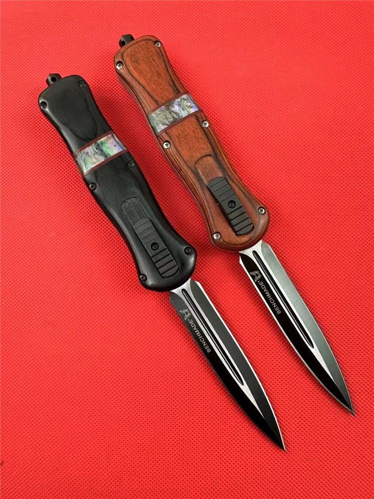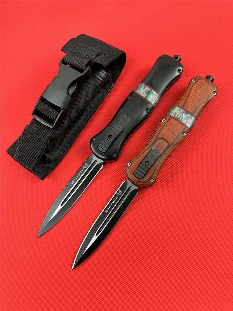 新版A109蝴蝶刀(红木柄) 全 长:22.9cm 刃 长:9.7cm 刃 厚:1.6mm 刃 材:D2 硬 度:59HRC 刀 重:204g 毛 重:287g 表 面:镀钛 柄 材:锌铝合金+檀木+彩贝壳 刀 鞘:尼龙 锁 闭:直出弹簧刀