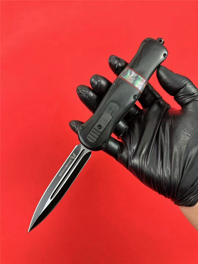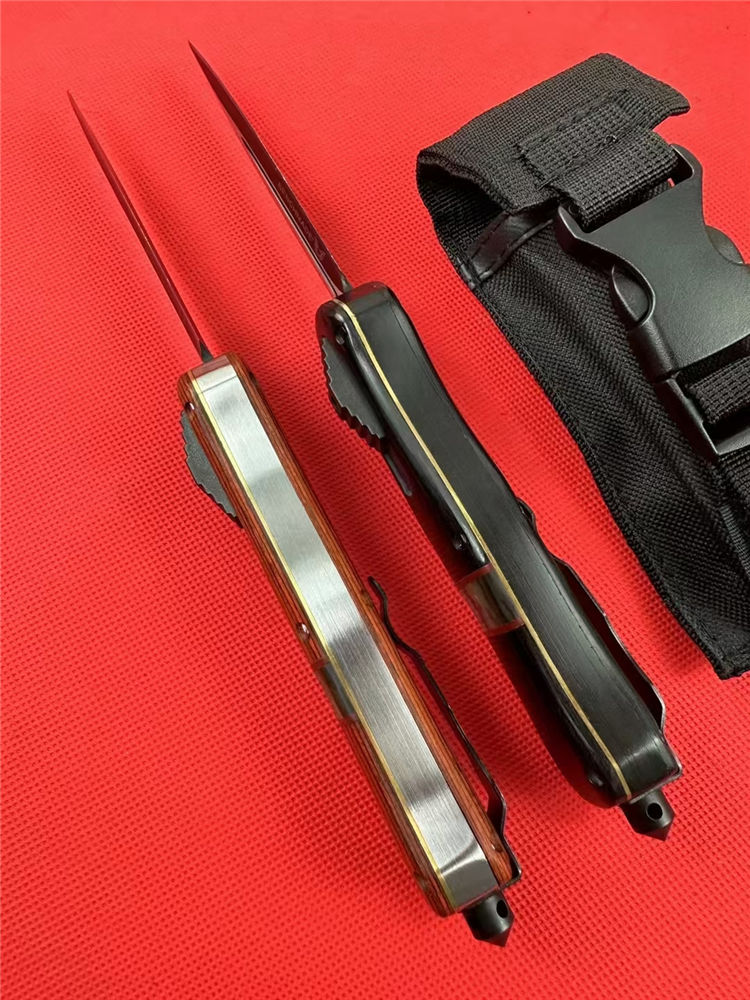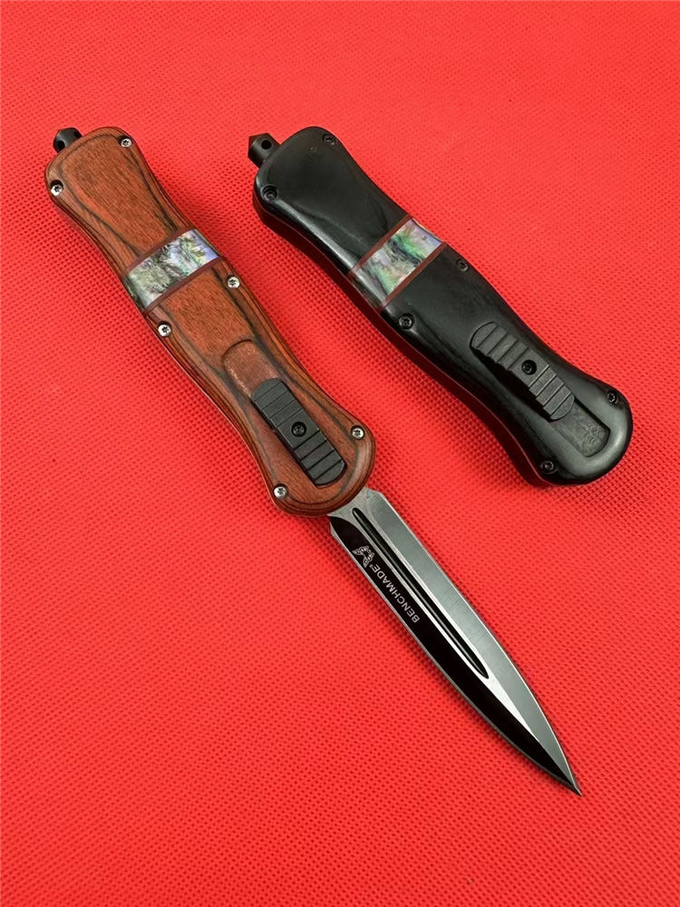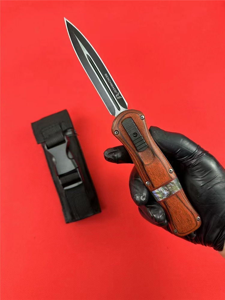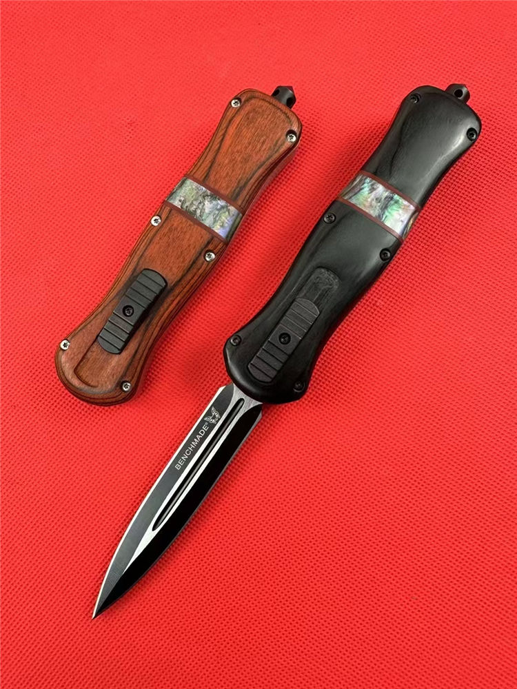 全 长:22.9cm 刃 长:9.7cm 刃 厚:1.6mm 刃 材:D2 硬 度:59HRC 刀 重:204g 毛 重:287g 表 面:镀钛 柄 材:锌铝合金+檀木+彩贝壳 刀 鞘:尼龙 锁 闭:直出弹簧刀