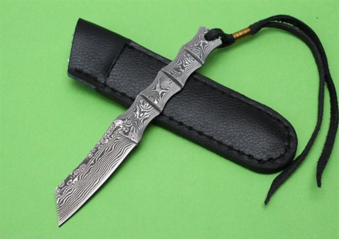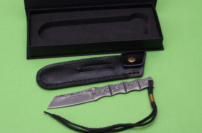 竹节一体钢大马士革直刀 全 长: 12.5cm 刃 长: 5cm 柄 长: 7cm 硬 度: 59HRC 刃 厚: 0.23cm 重 量: 100克左右 刃 材: 山东大马士革钢 表 面: 大马士革钢特有的花纹原色 其 他: 刃口锋利,真头层牛皮套,礼品纸盒 大马士革钢花纹颜色各异,以实物为准