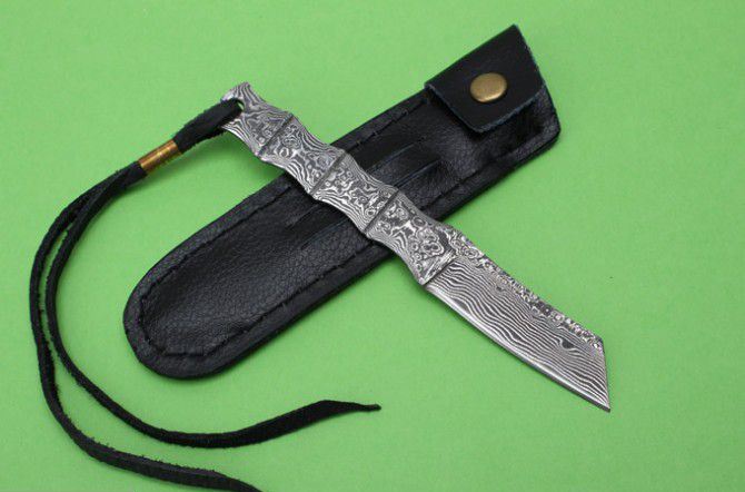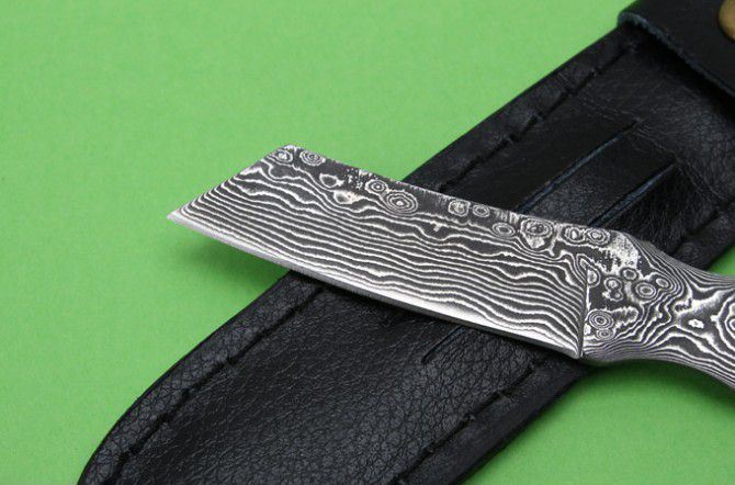 全 长: 12.5cm 刃 长: 5cm 柄 长: 7cm 硬 度: 59HRC 刃 厚: 0.23cm 重 量: 100克左右 刃 材: 山东大马士革钢 表 面: 大马士革钢特有的花纹原色 其 他: 刃口锋利,真头层牛皮套,礼品纸盒 大马士革钢花纹颜色各异,以实物为准