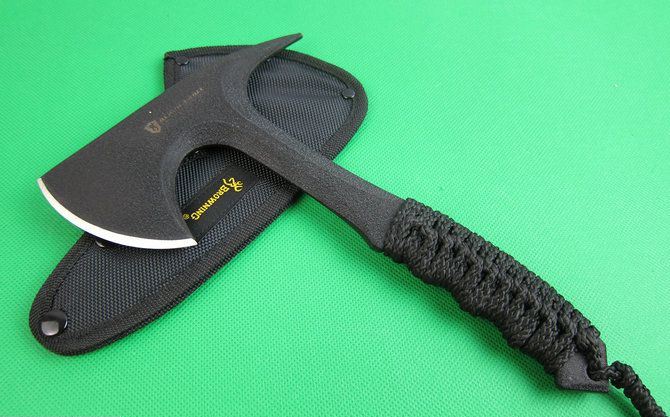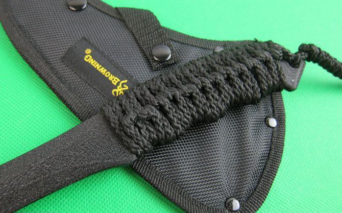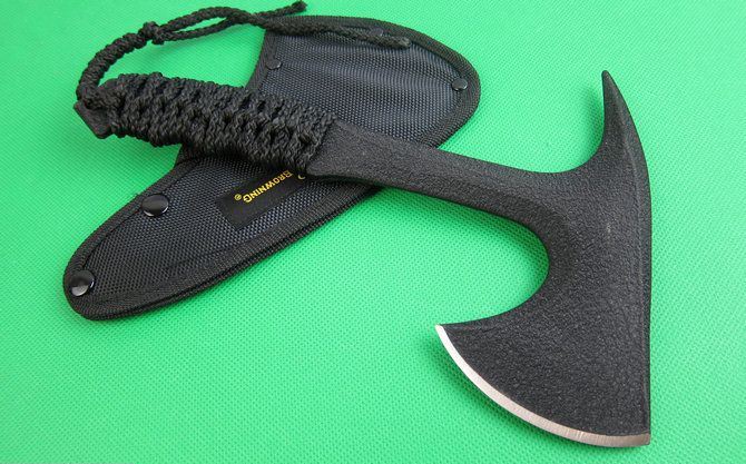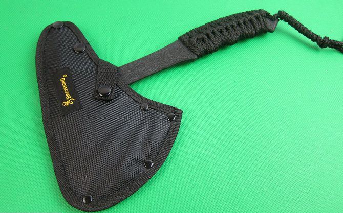 勃朗宁黑色战斧 全长;27CM 刃长:8.8CM 柄长:21CM 刃厚:1.48CM 刃宽:7.1CM 刃材:精铸钢,全刃开锋 柄材:高密度绳子 硬度:56-57 净重:790克 毛重:1001克(含尼龙袋、盒子) 表面:黑色 刀套:加厚尼龙(可绑在腰间)