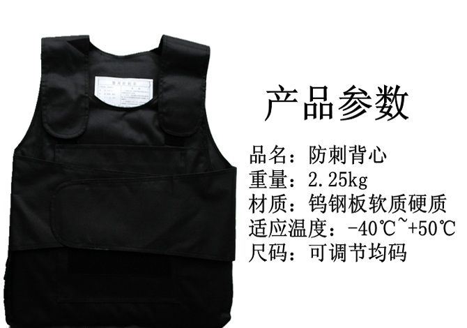 5、本防刺服符合公安部相关标准,防刺面积大于0.3平方米,在高温、常温、低温状态下,能有效地防住匕首,三棱刀、砍刀等利器的穿刺;
